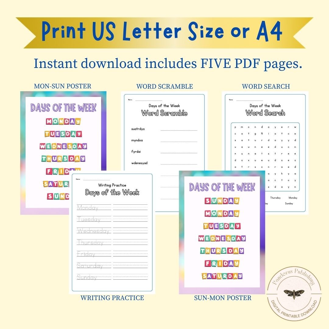 This 5-page Days of the Week printable bundle is perfect for helping kids improve handwriting, spelling, and memory skills while learning the order of the days. Great for early years, preschool, kindergarten, and primary school children.