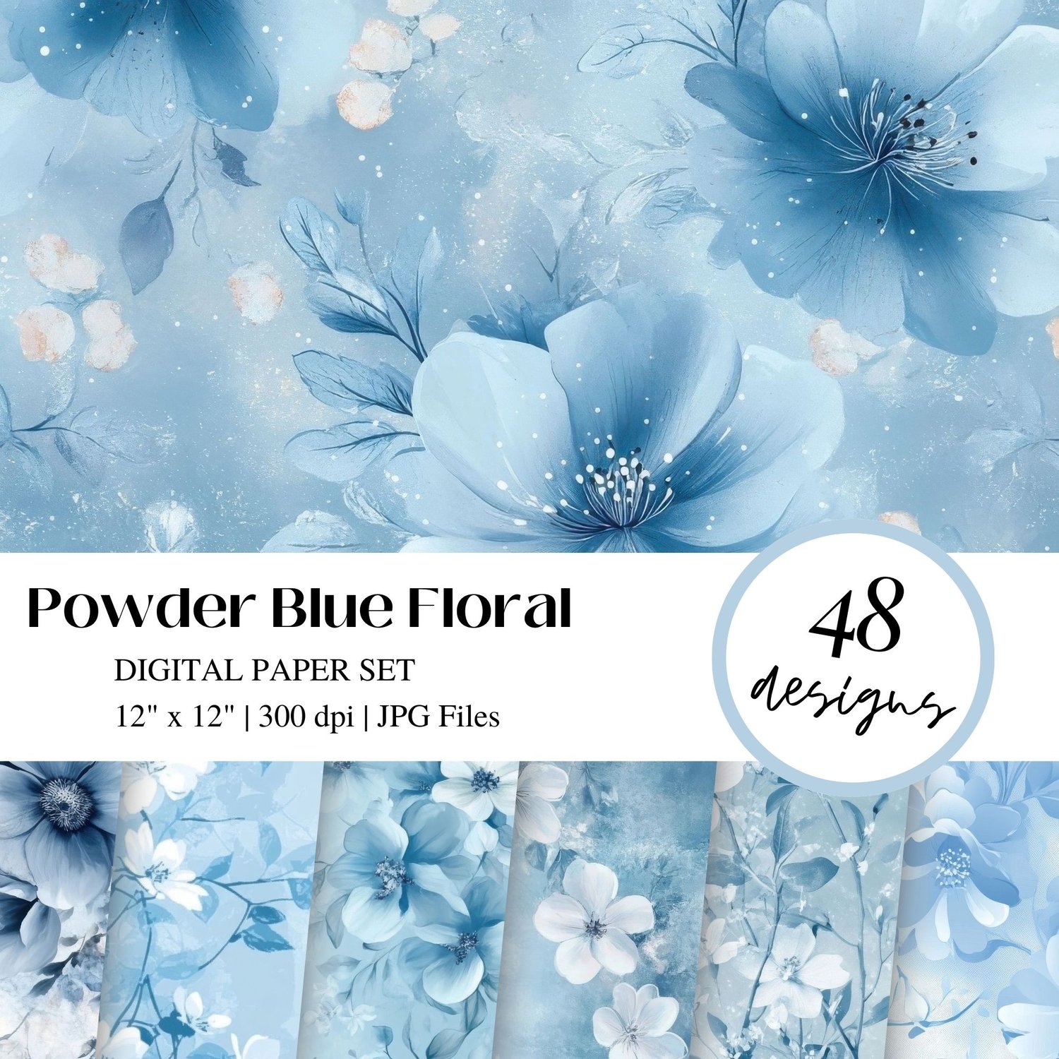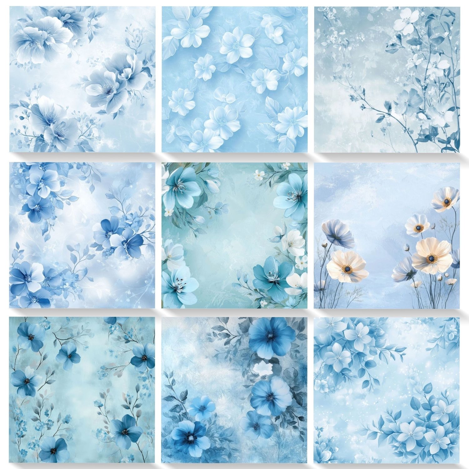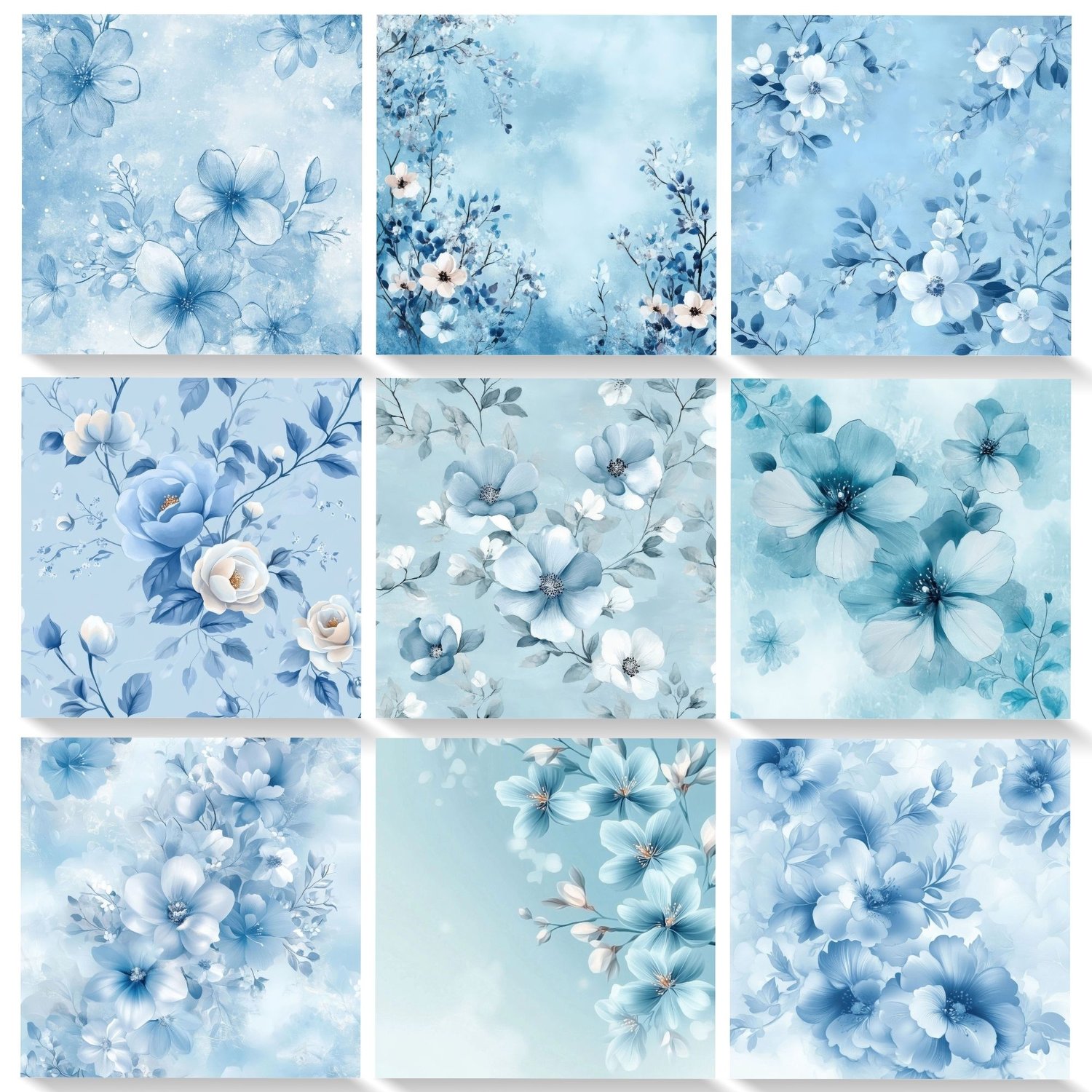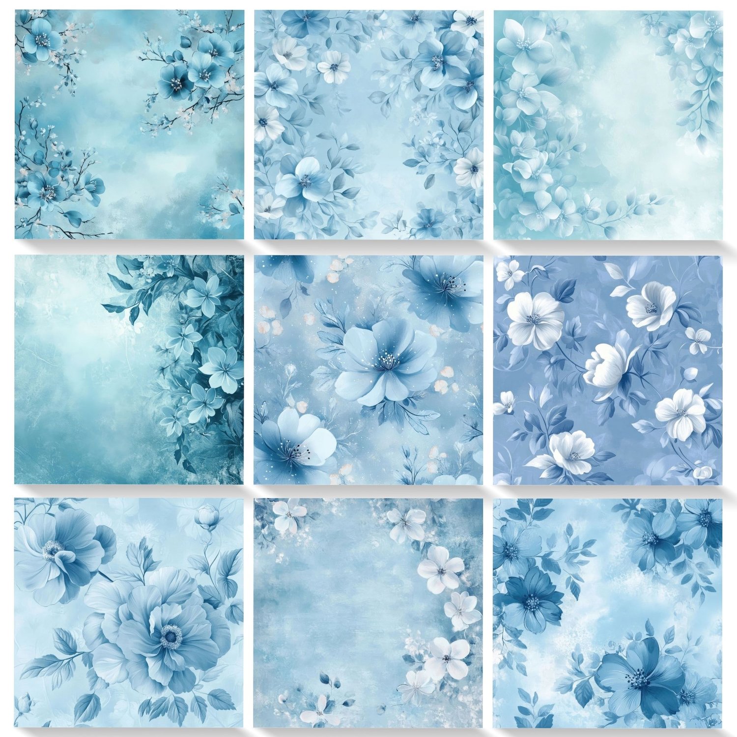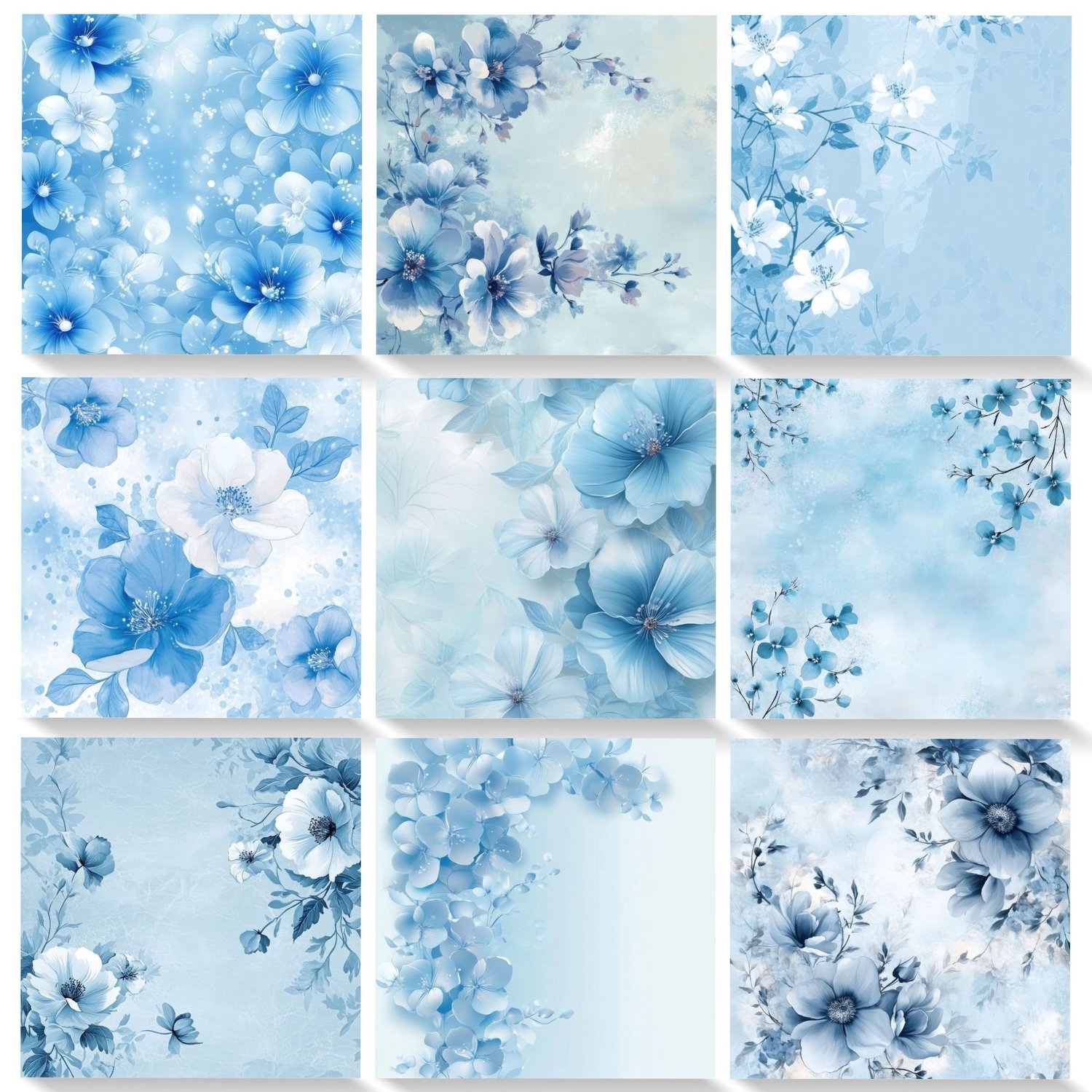 Elegant powder blue floral digital papers featuring watercolor flowers and romantic spring designs. Perfect for creating stunning wedding invitations, baby boy shower announcements, and baptism stationery. This collection of 48 high-resolution backgrounds combines soft blue blooms, delicate petals, and dreamy watercolor effects ideal for special event designs and celebration announcements.