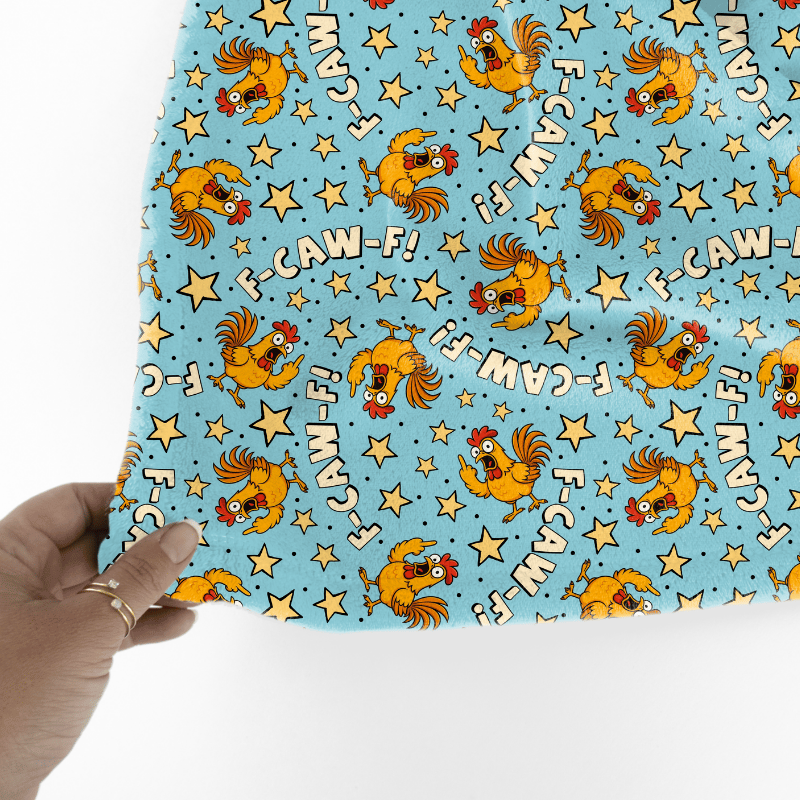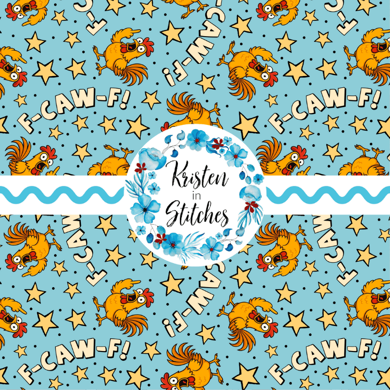 Sarcastic roosters saying "F-Caw-F" with middle fingers and stars on blue.