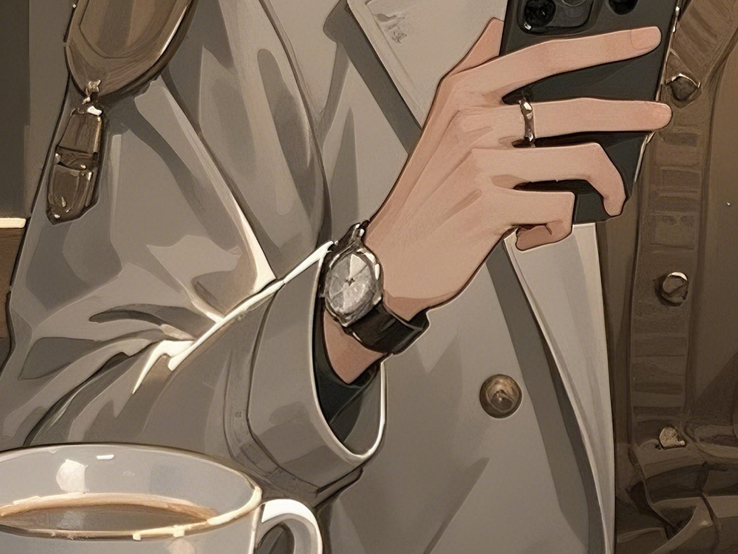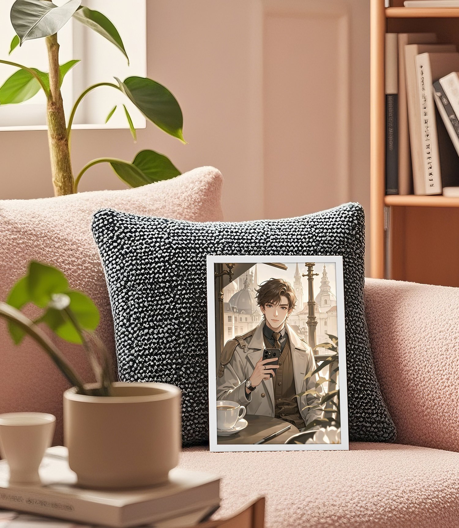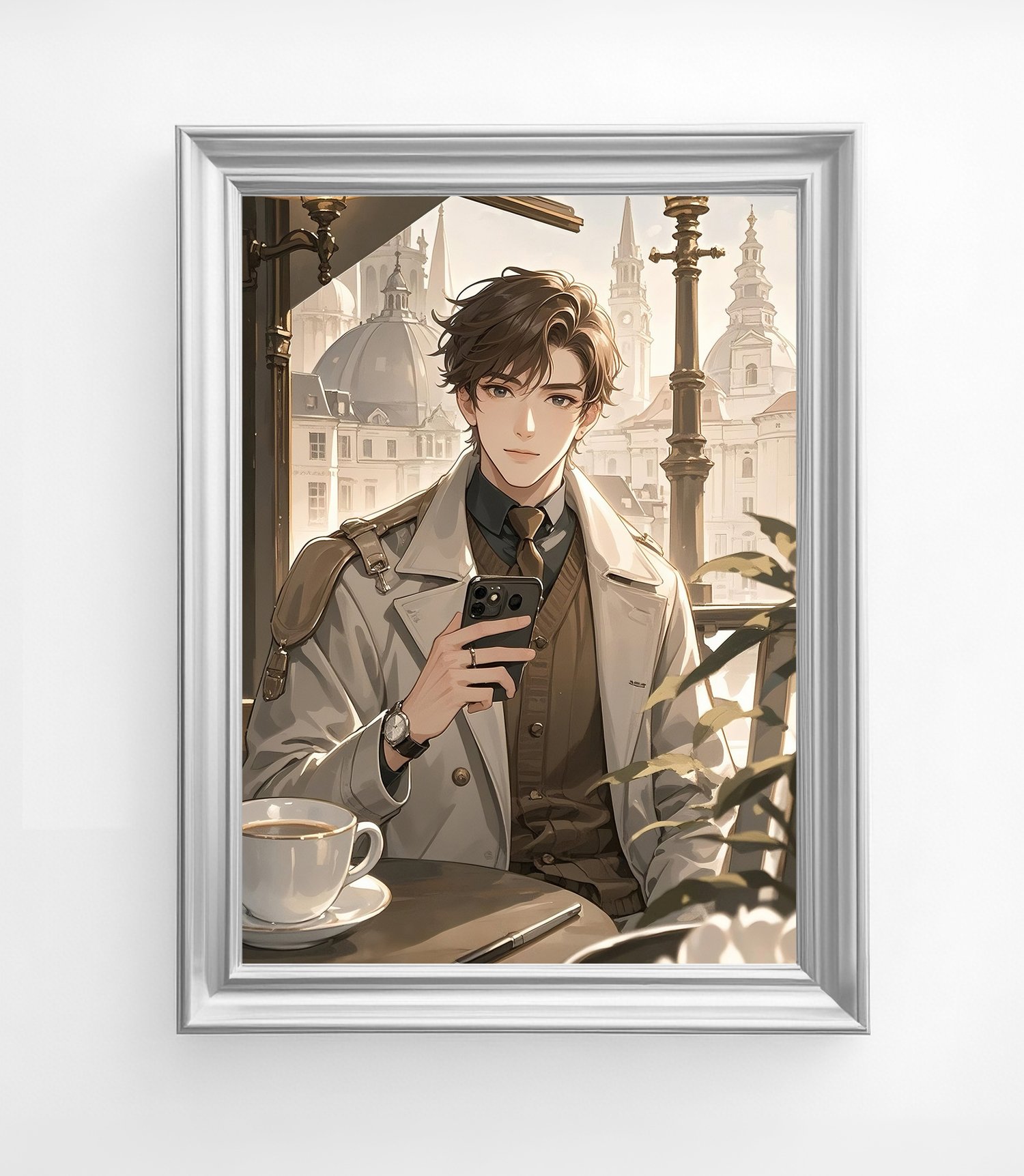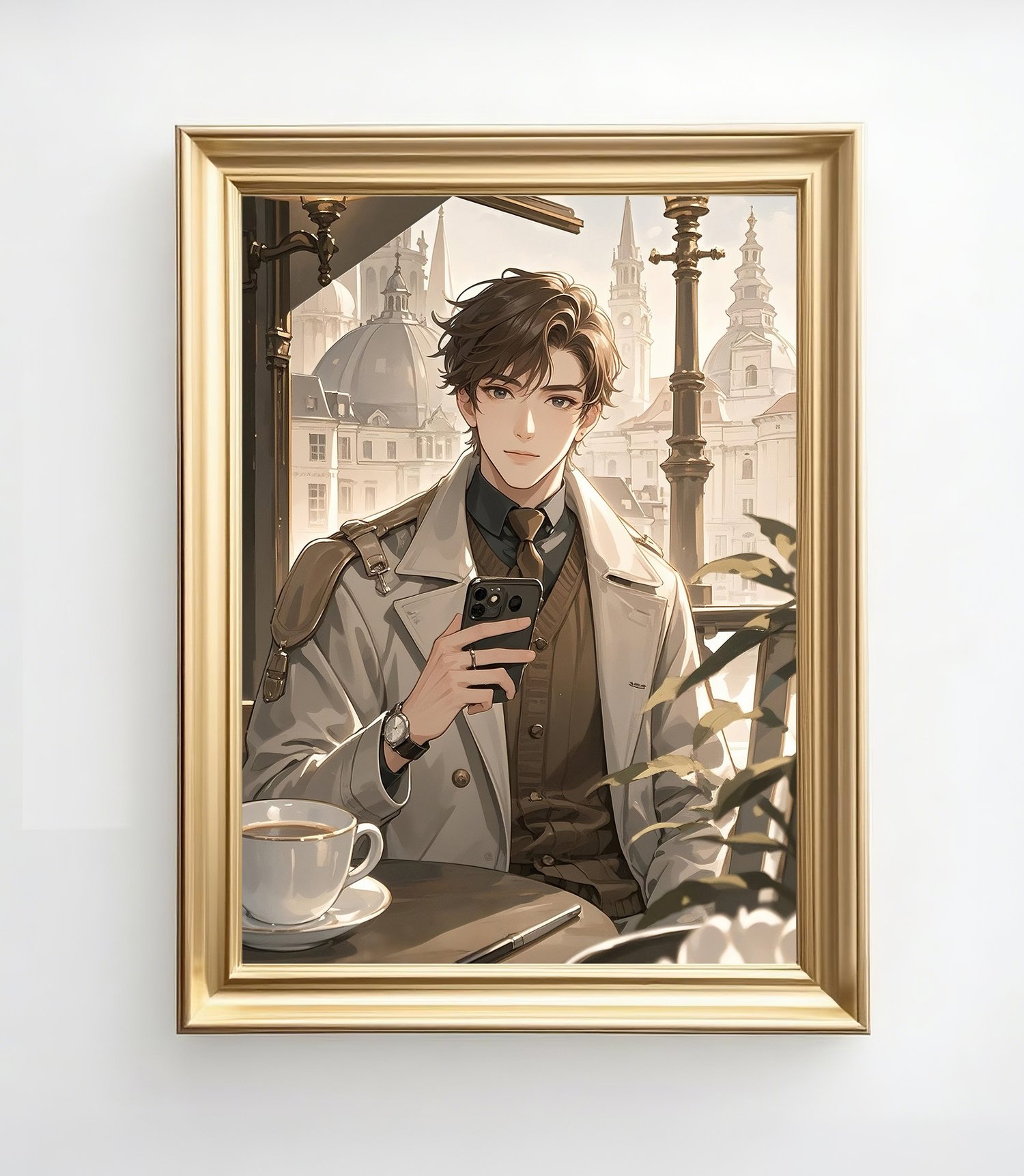 The composition is thoughtfully arranged: the café setting with the young man holding a smartphone conveys a balance between modern lifestyle and classic architecture.
