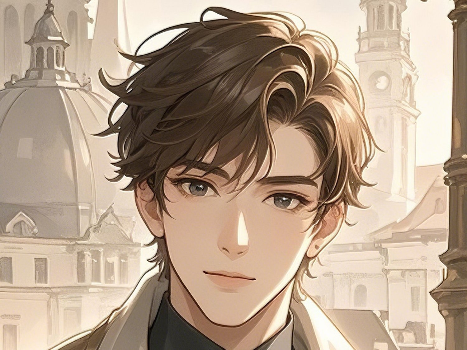 This artwork showcases a refined anime-inspired style, featuring an elegant atmosphere with a European cityscape in the background.