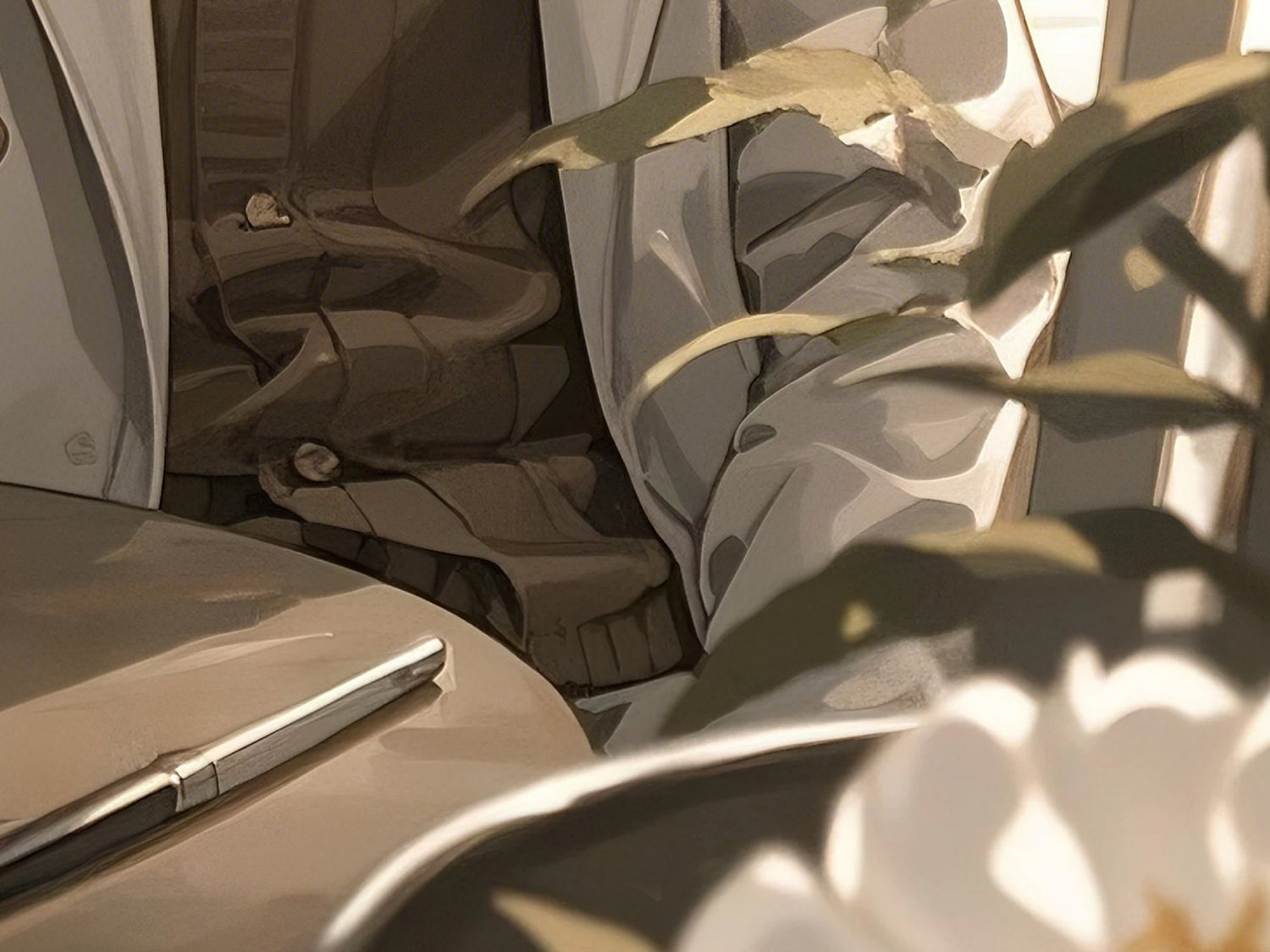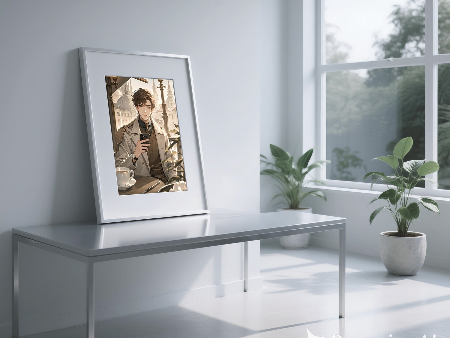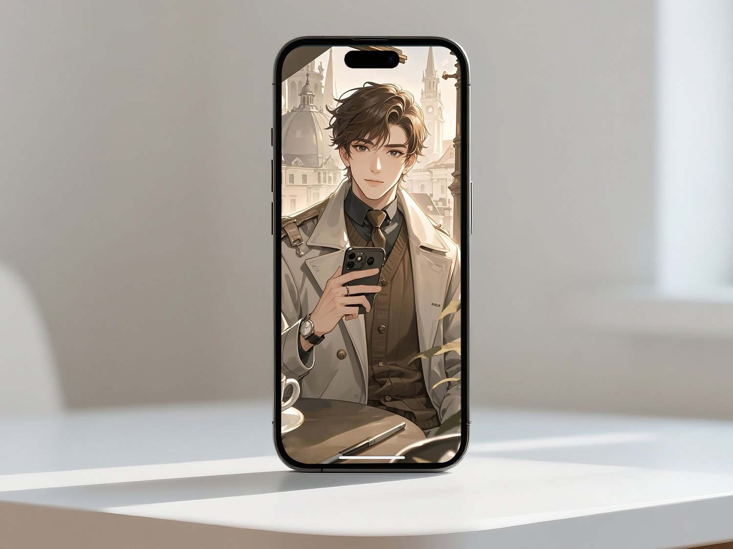 The character is depicted as a handsome and stylish young man, with sophisticated fashion choices (trench coat, knitwear, tie) that highlight a mature and modern charm. The handling of light and shadow is particularly well-executed, with soft sunlight seamlessly connecting the character to the background, creating warmth and a sense of sophistication.