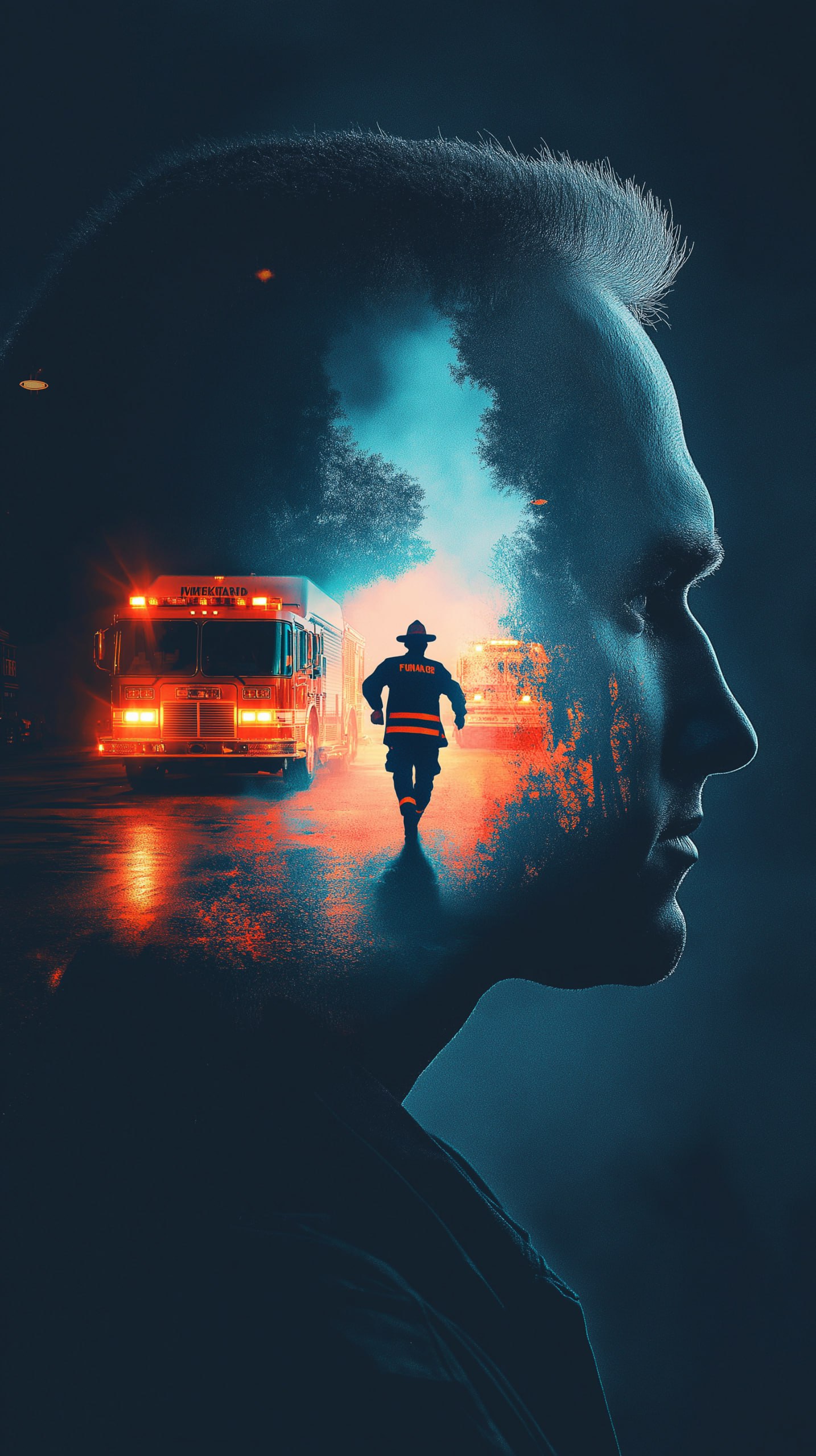 A striking digital artwork depicting a man’s profile with a hollow white interior, inside which a firefighter races forward amid a night scene. The background features firetruck and ambulance neon lights in orange and blue, contrasting sharply with dark surroundings, creating a gritty, cinematic atmosphere. Perfect for digital downloads, profile pictures, prints, or storytelling visuals — high-resolution, clean, watermark-free file included.
