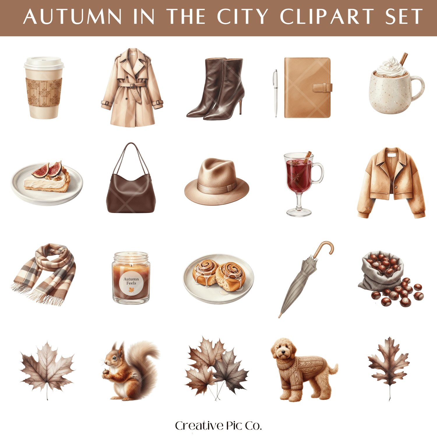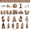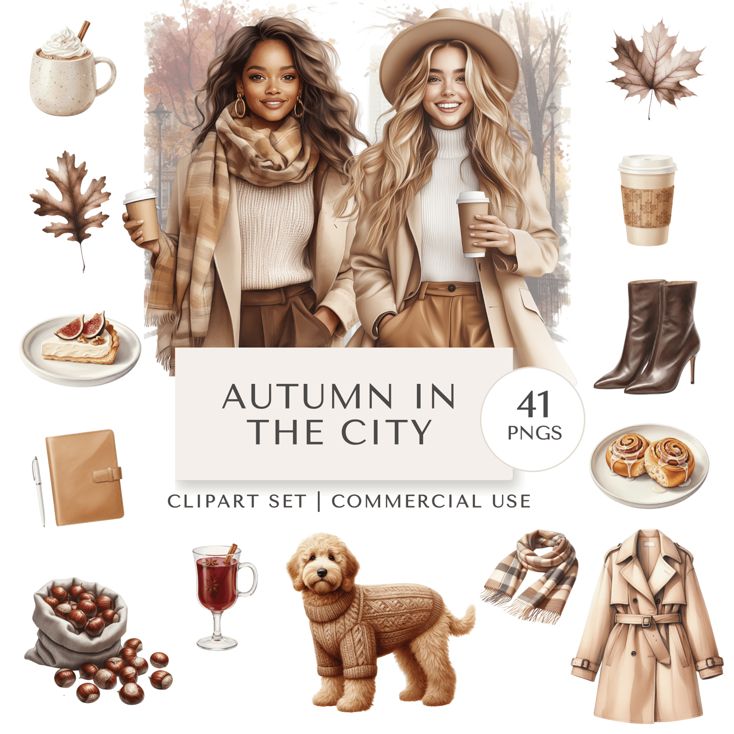 Capture the warmth of crisp city strolls with this Autumn in the City Clipart Collection. Featuring 41 high-resolution PNGs, this set includes cosy trench coats, boots, coffee cups, pastries, scarves, autumn leaves, pumpkins, and chic women in fall outfits. It also brings in stylish city scenes of brownstone stoops, cafés, bicycles, and park benches.