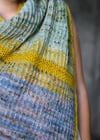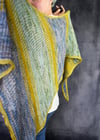 Schmale Streifen in zweifarbigem Patent leiten zum Kontraststreifen in Netzpatent über, hier gestrickt im gelben „Vivid“ – und sind die Namensgeber des Tuchs: Treelight ist eine Wortkreation und beschreibt Sonnenstrahlen, die durch Baumkronen scheinen.
