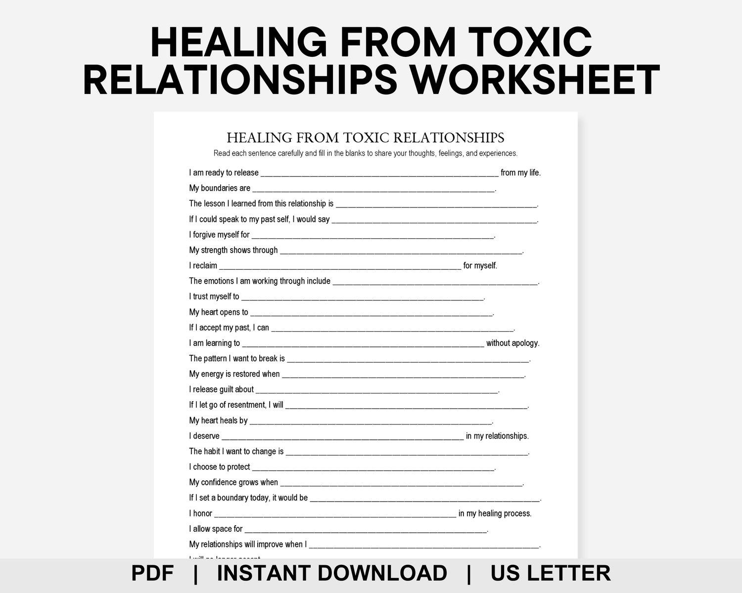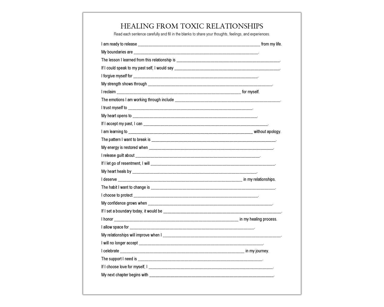 Do you want to break free from repeating the same relationship patterns? This Healing From Toxic Relationships worksheet features 30 prompts to reflect on what happened, validate your feelings, and set healthier boundaries for the future. Use it for therapy sessions, journaling, or self-reflection to create a clear action plan for your healing and growth. Own your story and step confidently into your power.