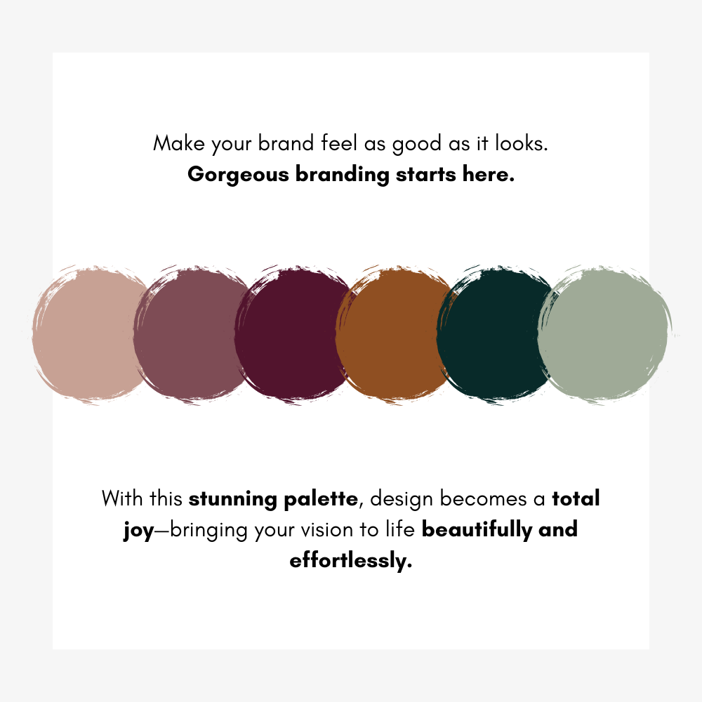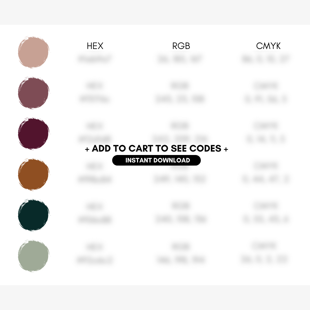 Introducing the Forbidden Romance Color Palette, a stunning collection of moody colors crafted to enhance your creative small business's branding design. This captivating palette offers a harmonious blend of blush beige, mauve, burgundy, burnt copper, dark evergreen, and sage green—ideal for creating an alluring and sophisticated brand identity and website color scheme. Designed for both designers and entrepreneurs, our color kit provides precise Hex Codes, RGB, and CMYK values, ensuring smooth integration across print and digital platforms when using tools like Canva or Procreate. Elevate your marketing materials, social media presence, and Shopify or WordPress site. Whether you're designing a logo, banner, or entire brand identity, the Forbidden Romance palette offers a rich, evocative backdrop that exudes elegance and mystery. Transform your brand's visual storytelling and captivate your audience today.