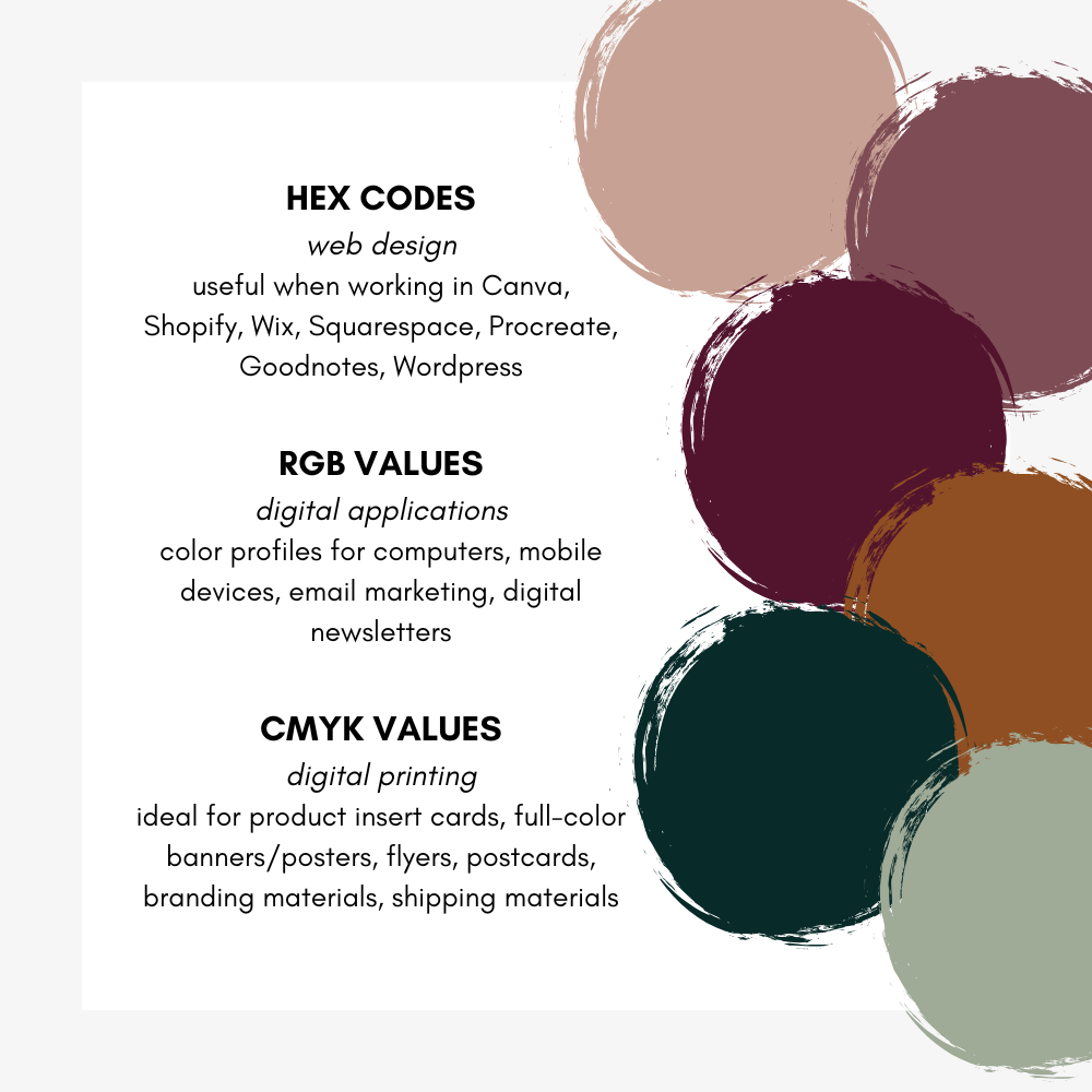 + Detailed Hex Codes, RGB, and CMYK values for each color