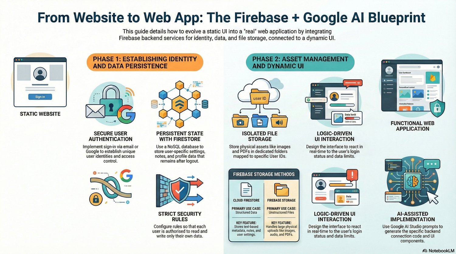 From Website to Web App is a step-by-step technical guide designed for developers, founders, and no-code/low-code builders who want to transform a static website into a fully functional, scalable web application using Firebase and Google AI.
