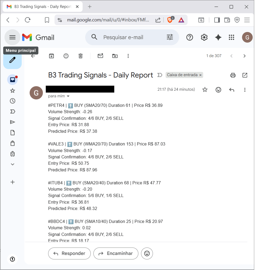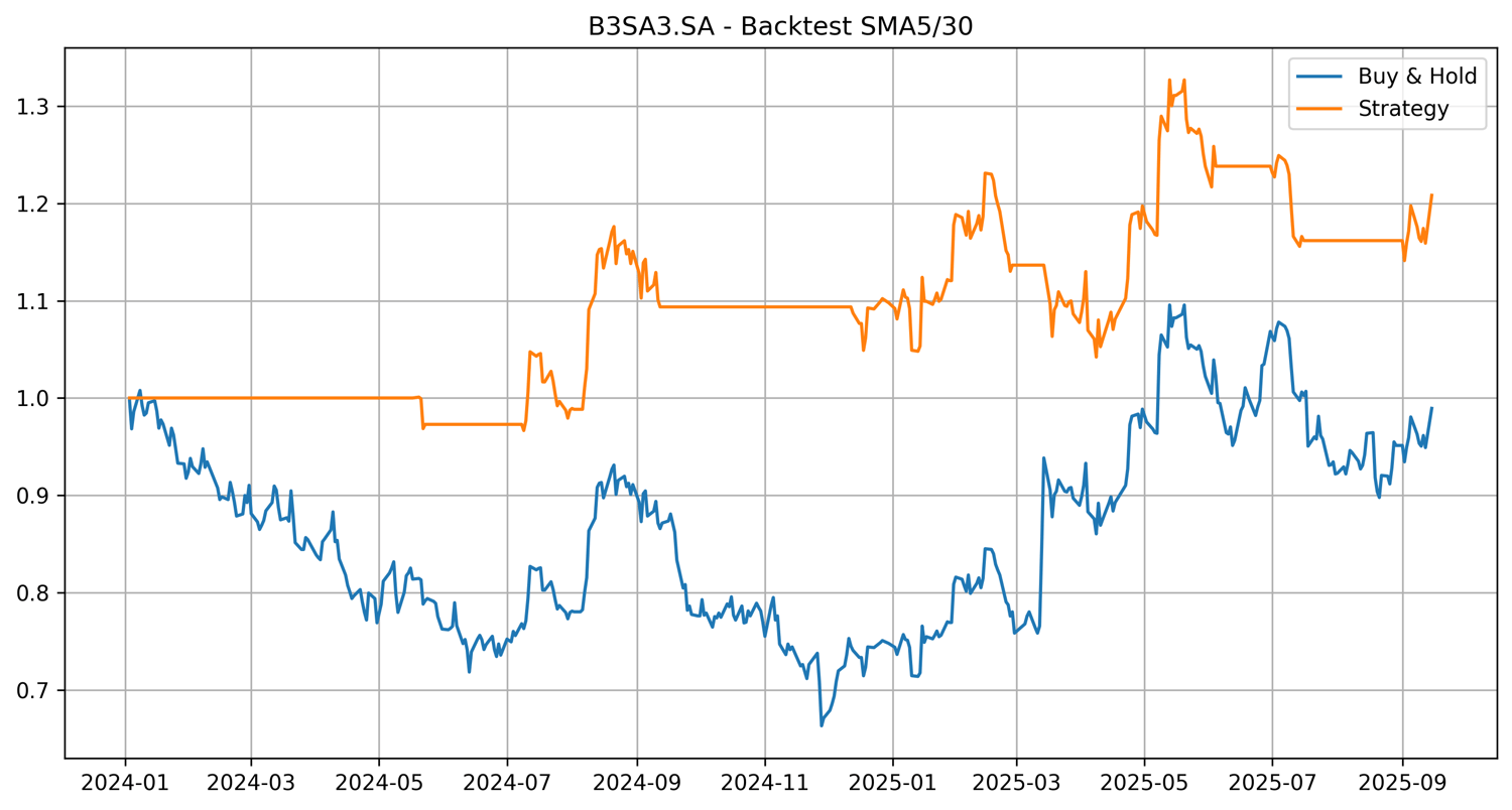 This project provides a Python script for **automatic generation of buy and sell signals for assets on B3 (Brazilian Stock Exchange)**, applying strategies with technical indicators to time series of the spot market. It includes a script for ***backtesting* and selecting the best-performing strategies**, allowing for evaluation of the approaches before applying them.