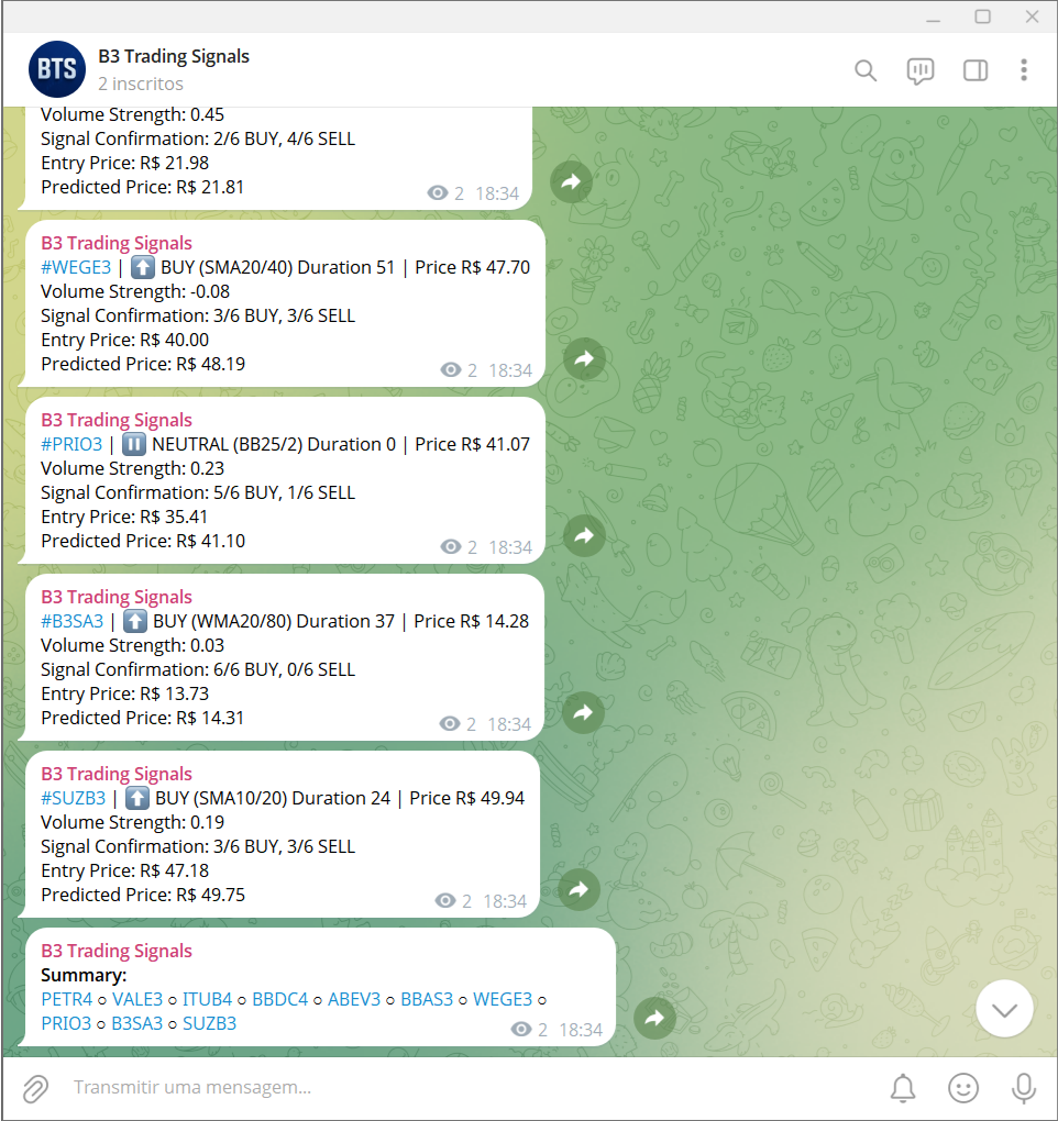 Telegram open channel with daily signals run via GitHub Actions, which anyone can sign up to get a feel for what this bot can offer: