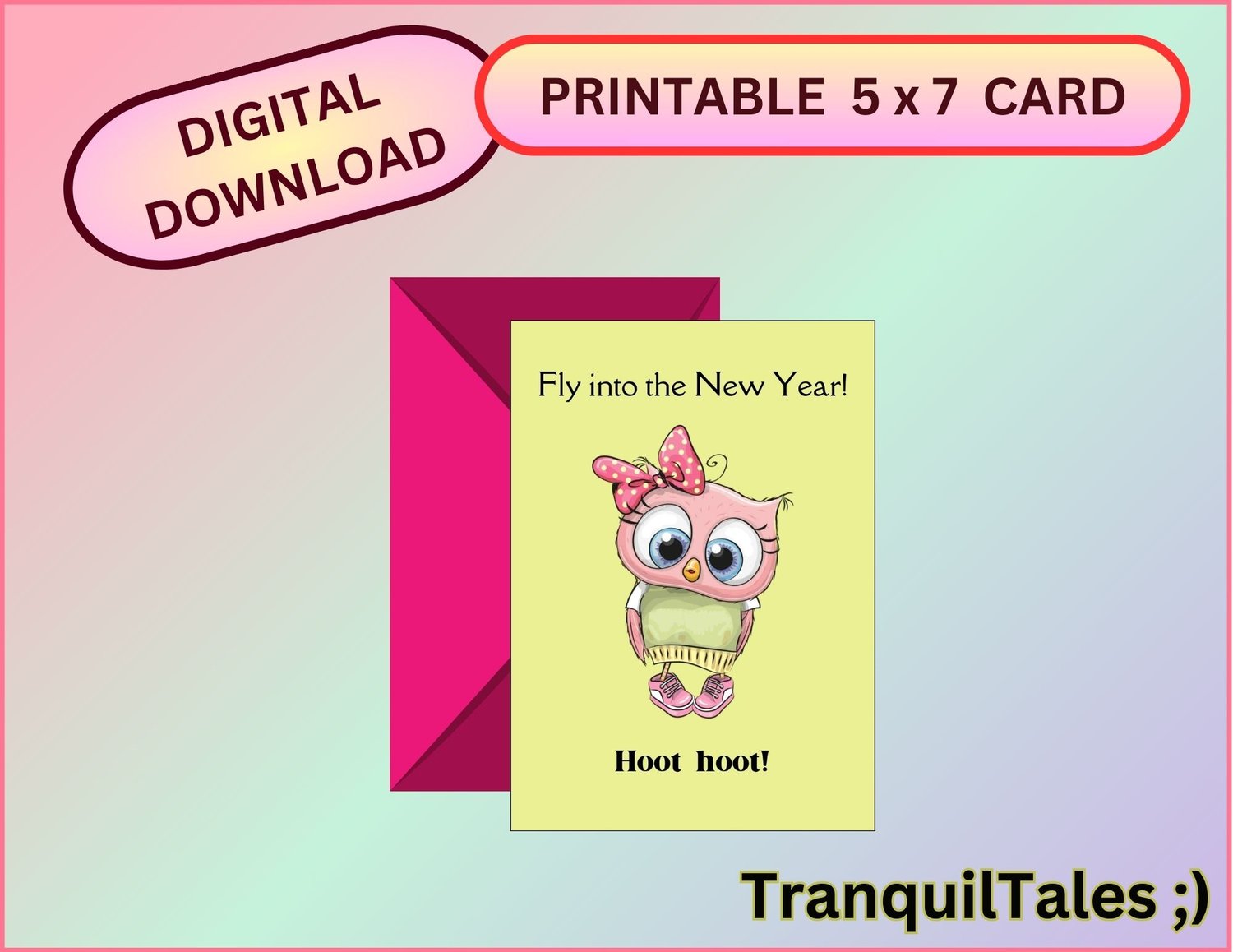 Fly into the New Year! Hoot hoot! Card - 5" x 7" inches - New Year card - PDF File