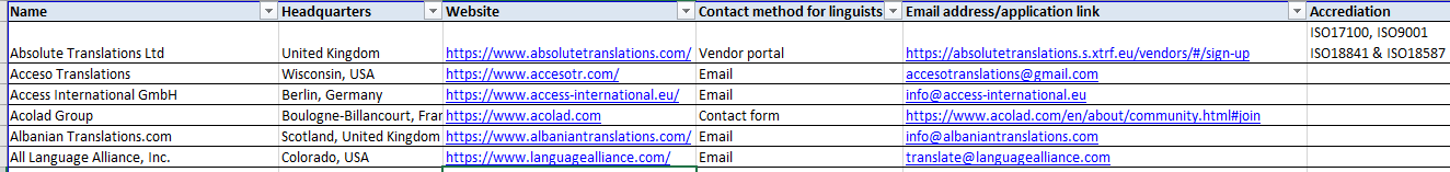 A curated, ready-to-use directory of translation agencies worldwide, with verified websites, contact methods, and accreditation notes to accelerate outreach and partnerships.