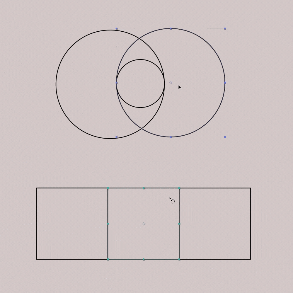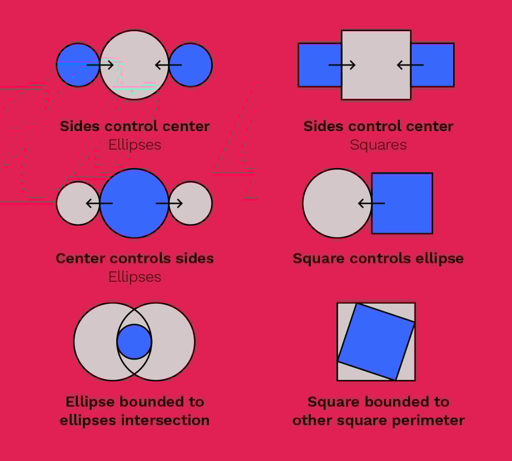 This collection of shape combinations has a shape (B) with an expression on its size property that keeps it always tangent to the controller shape (A). With these compositions you can create beautiful and even complex shape animations with the satisfying effect given by them never breaking tangency, while doing it by hand would be nearly impossible (I tried).