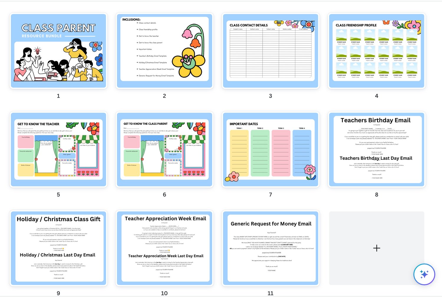 The "Class Parent Resource Bundle" is a comprehensive collection of materials and resources designed to support parents and guardians in their involvement in their child's education. This document contains a wealth of information and guidance about how parents can best support their child's academic and social development, including tips for effective communication with teachers, strategies for helping with homework, and suggestions for creating a positive learning environment at home. Additionally, the "Class Parent Resource Bundle" includes a range of printable materials such as checklists, activity ideas, and templates for parent-teacher conferences. It is an invaluable tool for any parent or guardian looking to play an active role in their child's education.