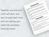 With questions already crafted for each of the levels, you wont have to worry about what to ask next allowing you to focus on engaging and supporting your client!