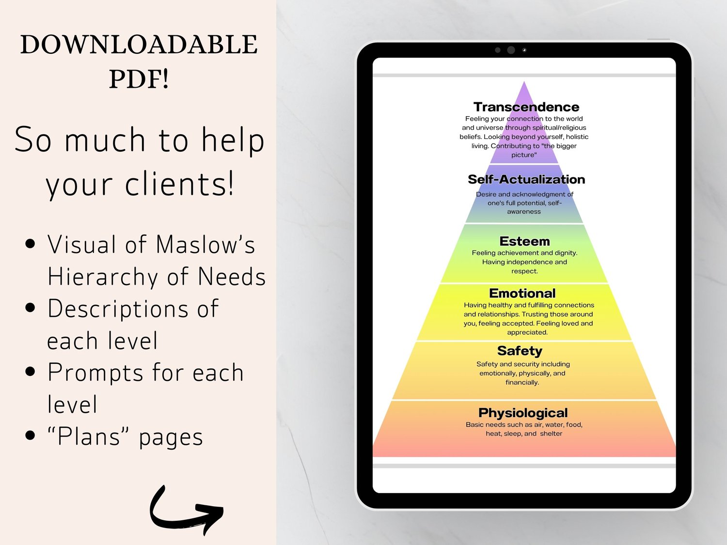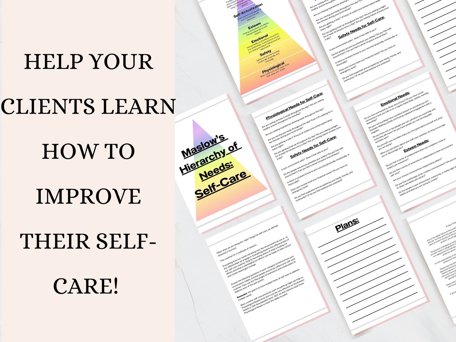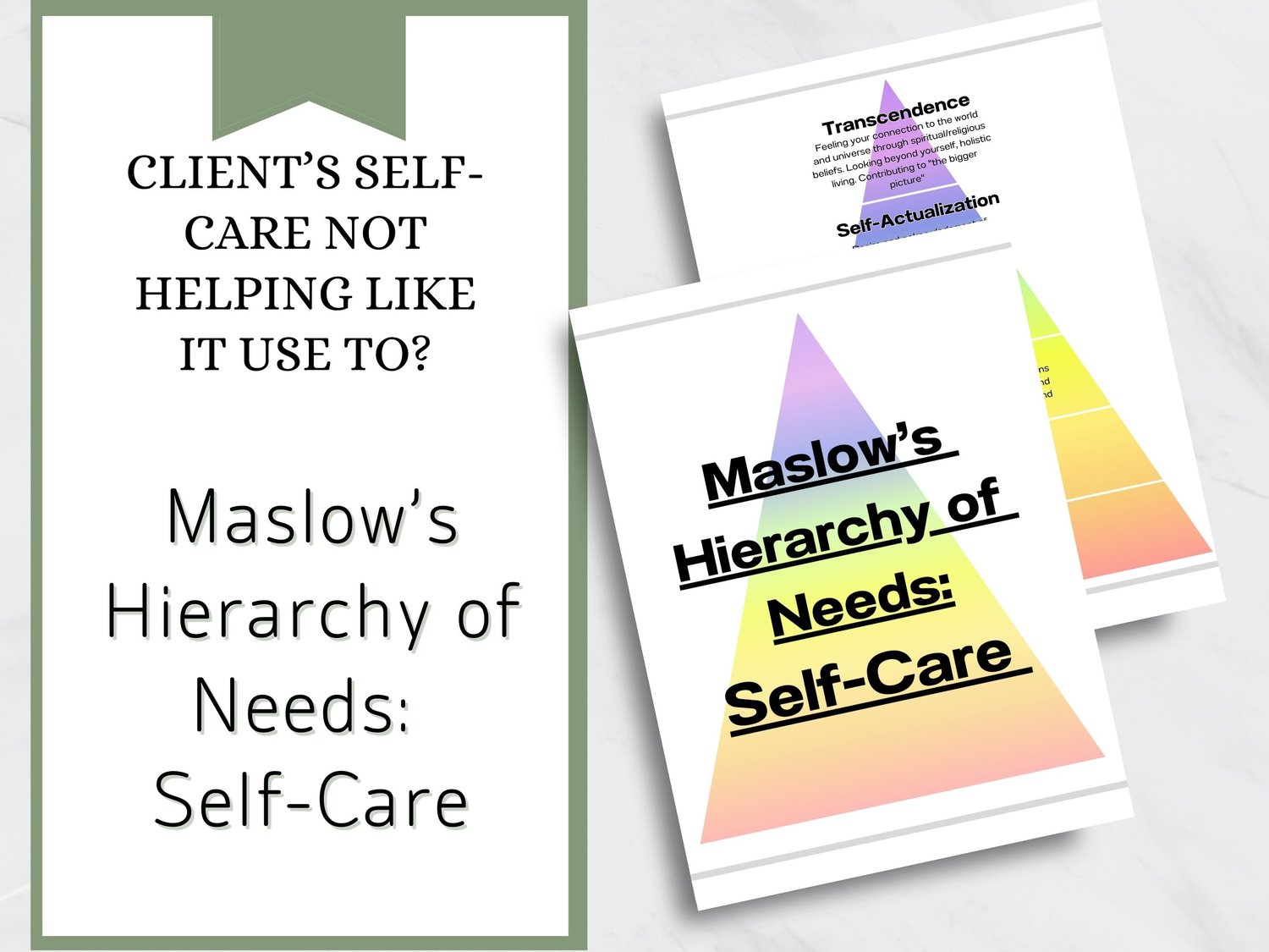 Using Maslow's Hierarchy of Needs, you and your client can find out which types of self-care routines are missing from their day-to-day activities. By becoming aware of what needs are being left unfulfilled in their self-care practices, clients can begin to tap into their creativity to find new ways to meet these needs in new ways!
