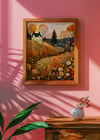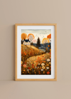 Autumn Whimsy— This whimsical print invites you into a golden-hour fairytale where wildflowers sway like confetti across a rolling hillside. An inviting cottage perches atop a trail that seems to hum with the crunch of leaves underfoot. The amber glow of autumn trees, pops of coral, and dreamy blush-pink blooms give the entire scene a honeyed, cozy feel. It’s a tribute to sweater weather, long walks, and the comfort of coming home.