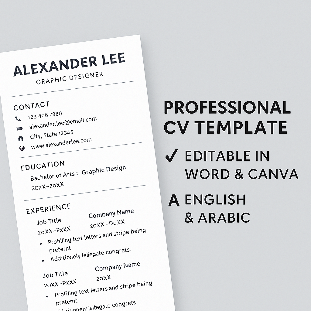 A clean and modern CV template in both Arabic and English. Fully editable in Word and Canva. Perfect for job applications and freelance profiles.
