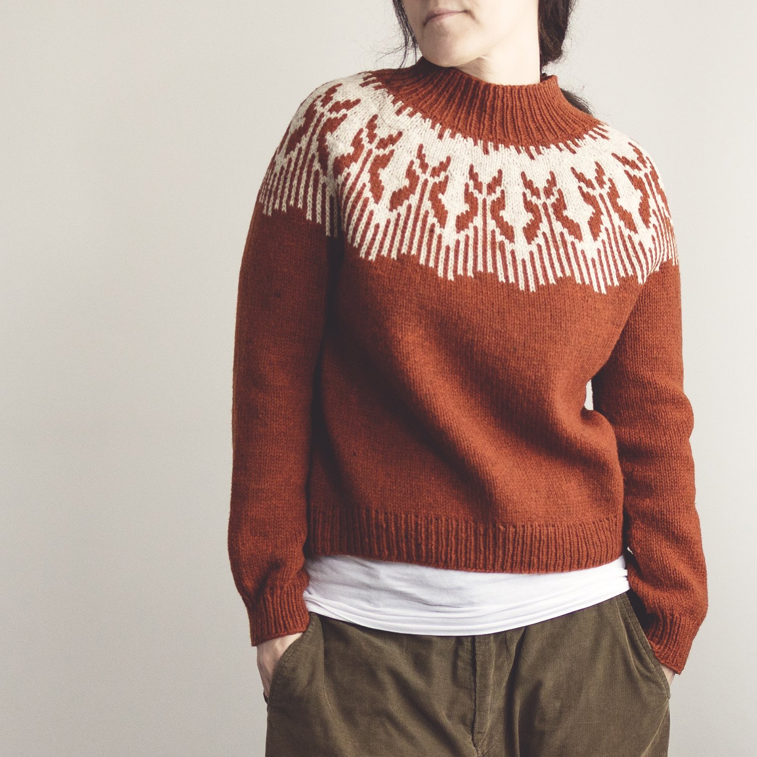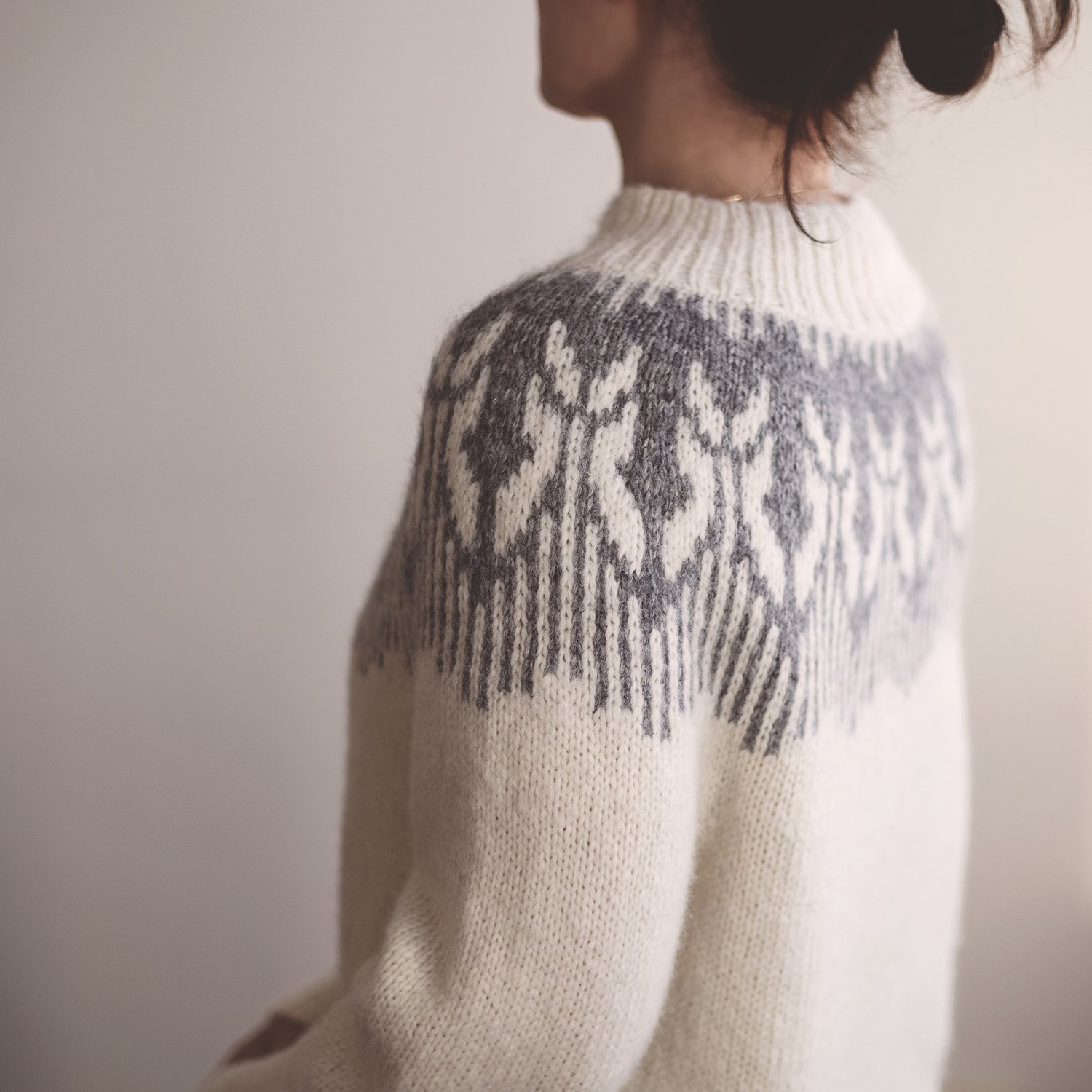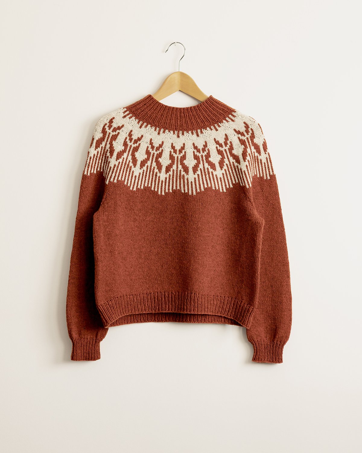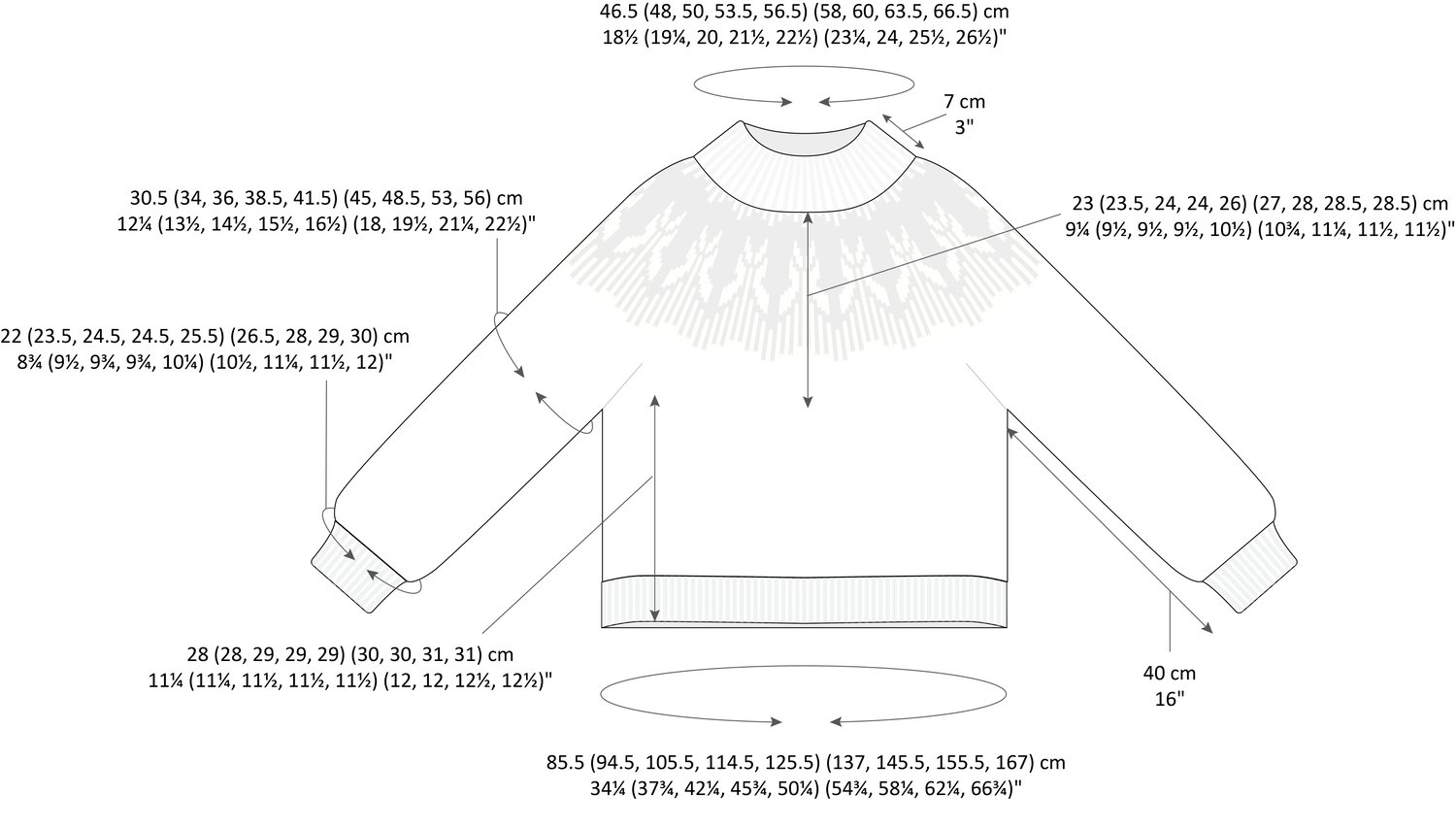 The sweater is worked in the round from the top down, starting with the colorwork yoke. After the colorwork motif is completed, short rows are used to raise the back and improve the fit at the neckline. The yoke is finished with a few raglan rounds before separating for body and sleeves.
