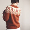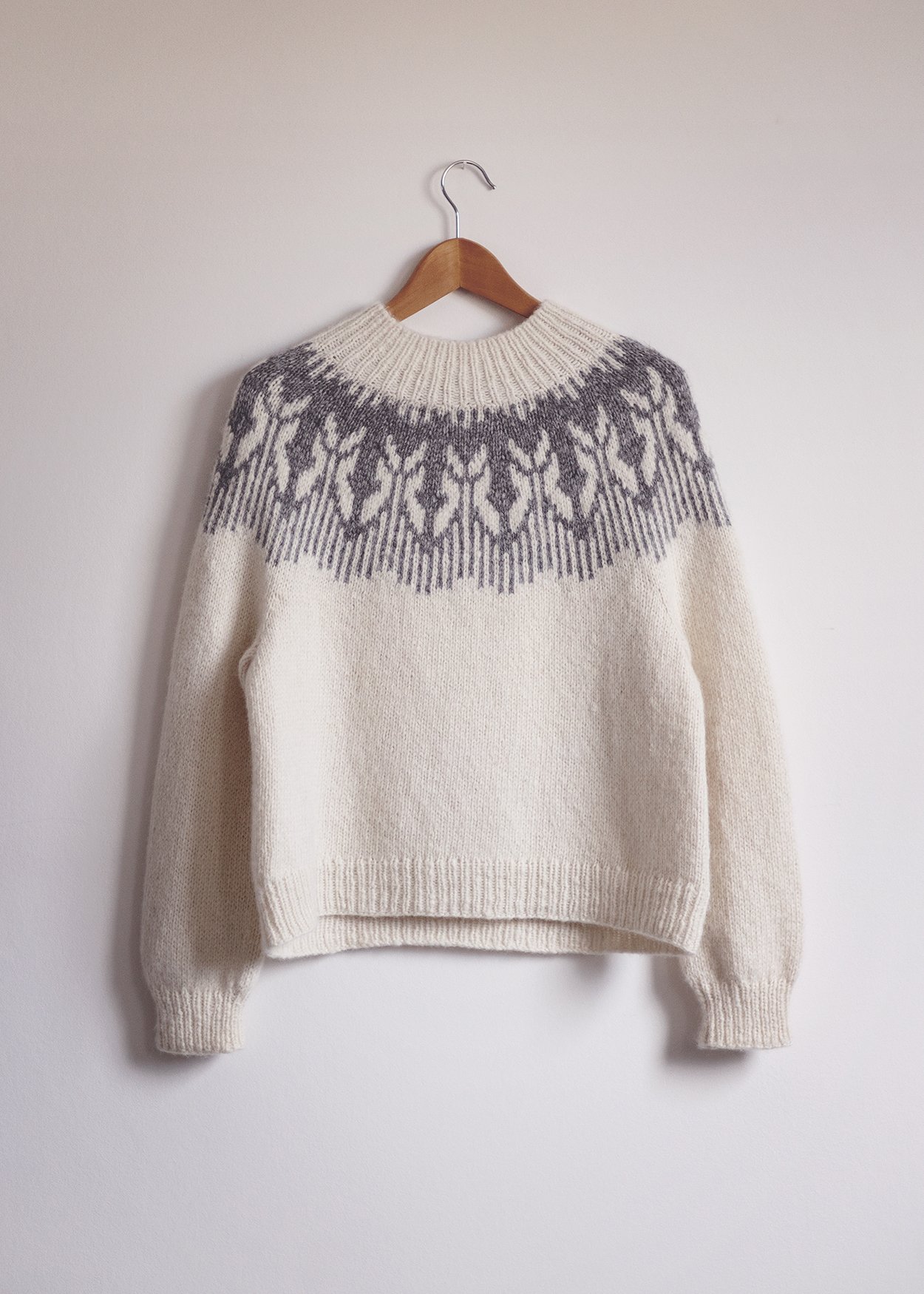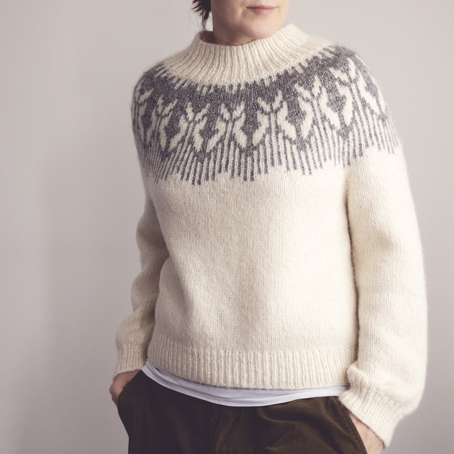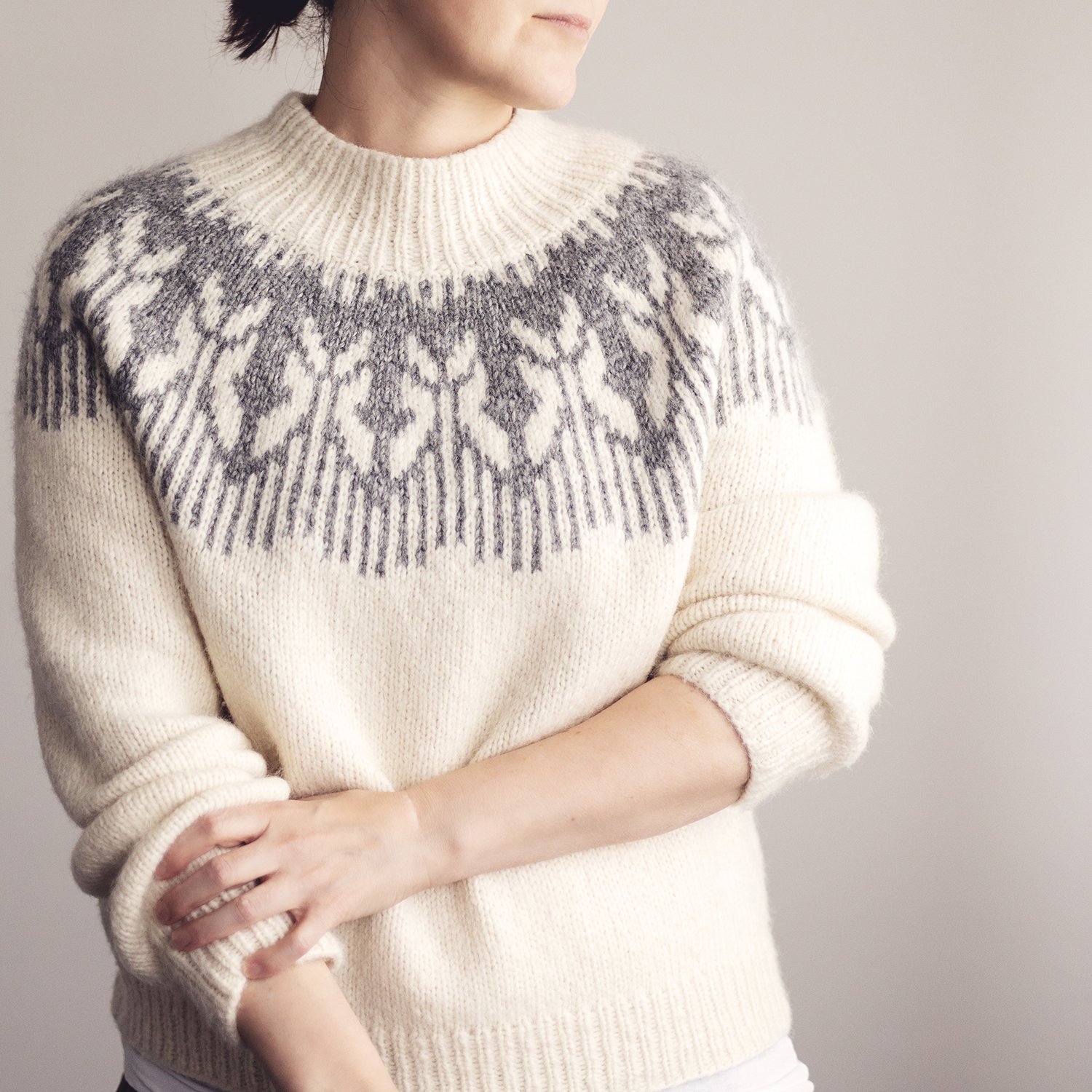 The sweater is worked in the round from the top down, starting with the colorwork yoke. After the colorwork motif is completed, short rows are used to raise the back and improve the fit at the neckline. The yoke is finished with a few raglan rounds before separating for body and sleeves.