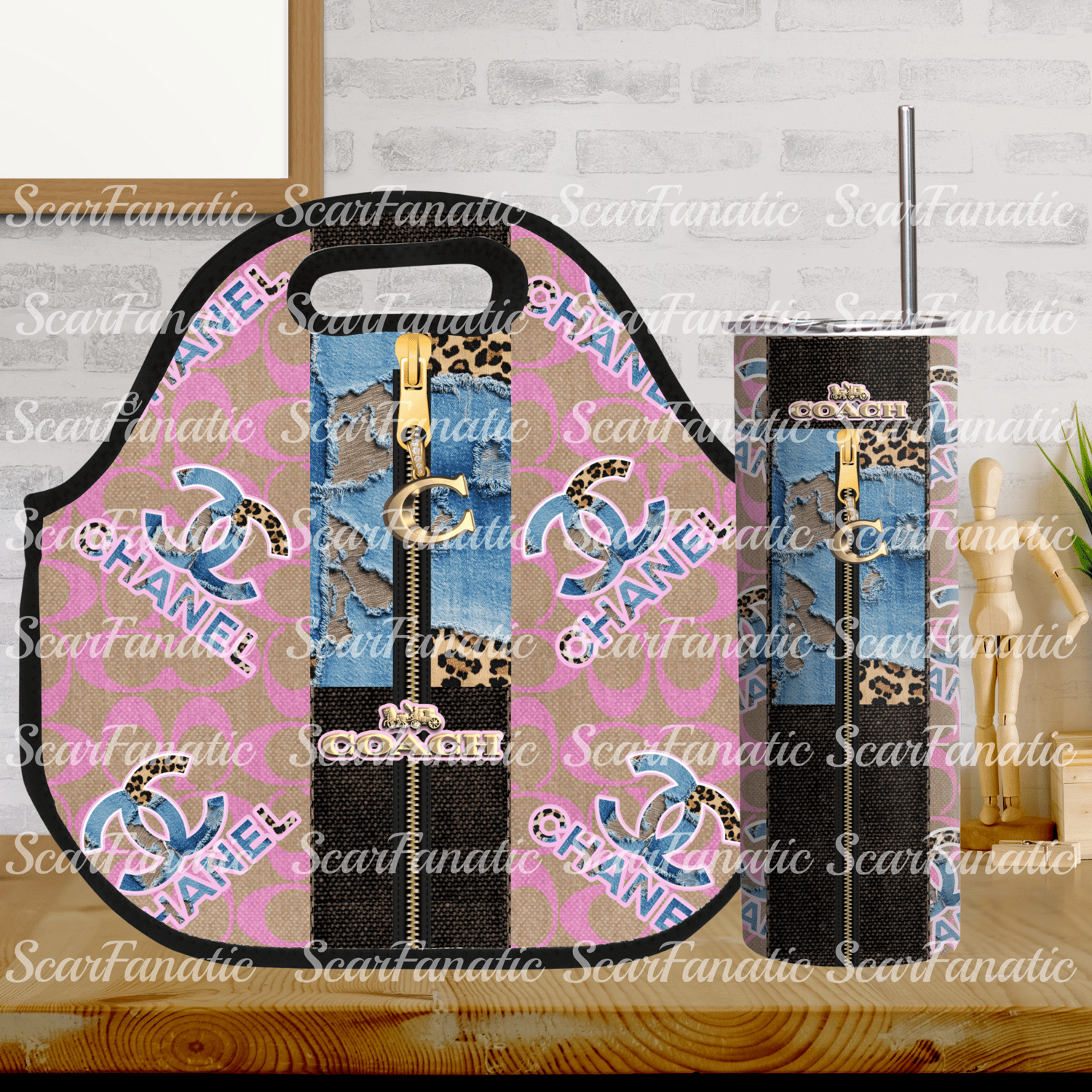 Pink and Tan, Denim Blue, and Leopard Print Cch Chnl 20oz Tumbler and Lunch Tote PNG Design Bundle