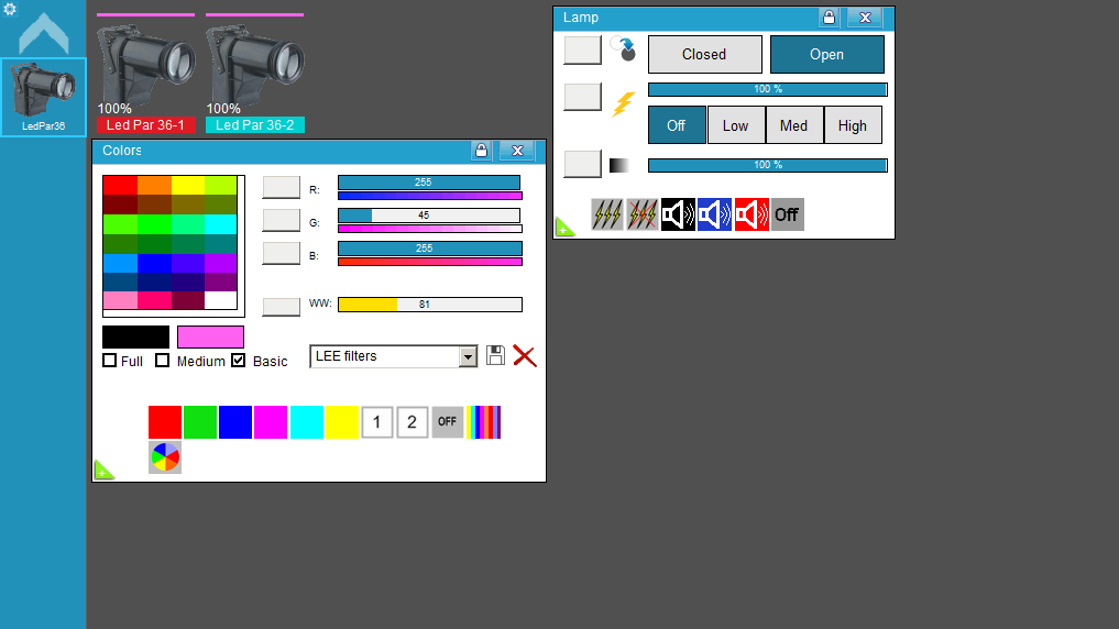- Acceso directo a Colores básicos: Rojo, Verde, Azul, Magenta, Celeste, Amarillo, Blanco Puro y Blanco Full.