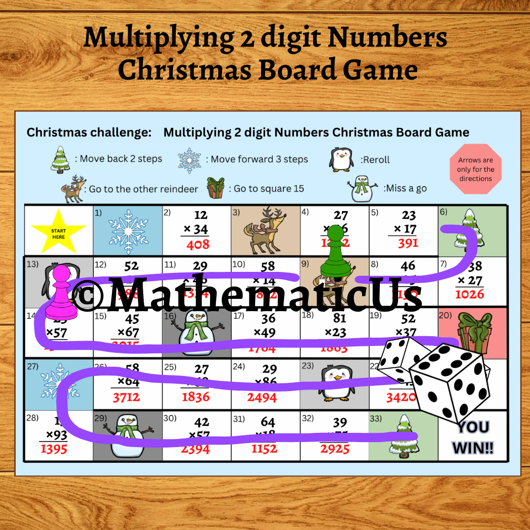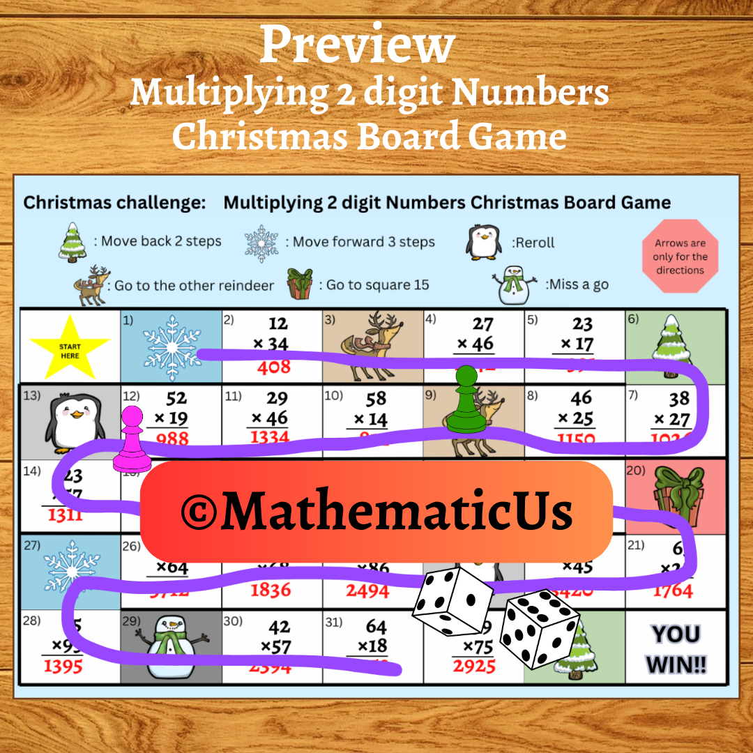 Multiplying 2 digit Numbers Christmas Board Dice Game