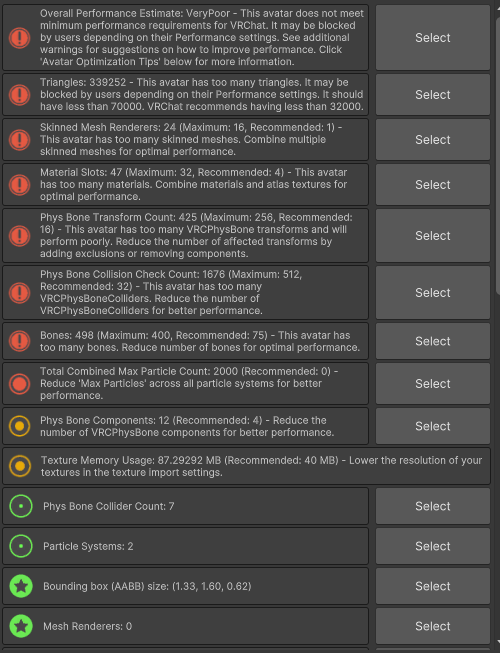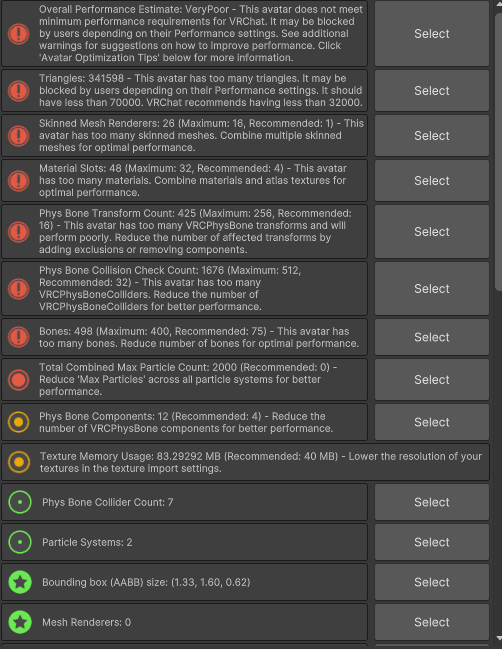- This avatar is on the heavier side. In the future, I hope to be able to optimize more and hopefully eventually update this one with a more optimized version, but for now it remains pretty heavy. Please feel free to remove items that you don't want to bring the size down a bit.