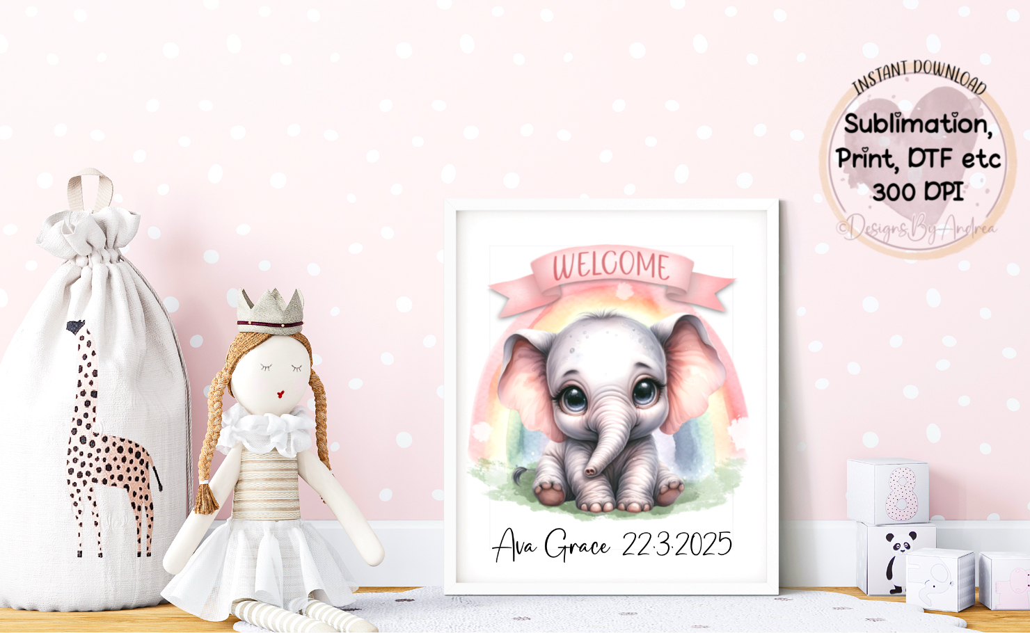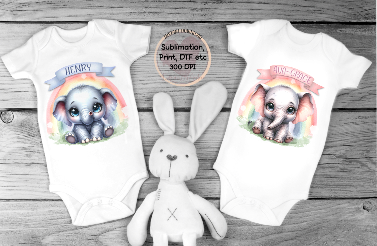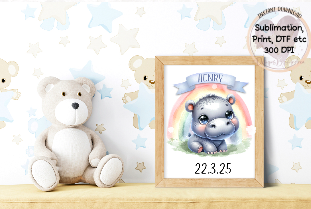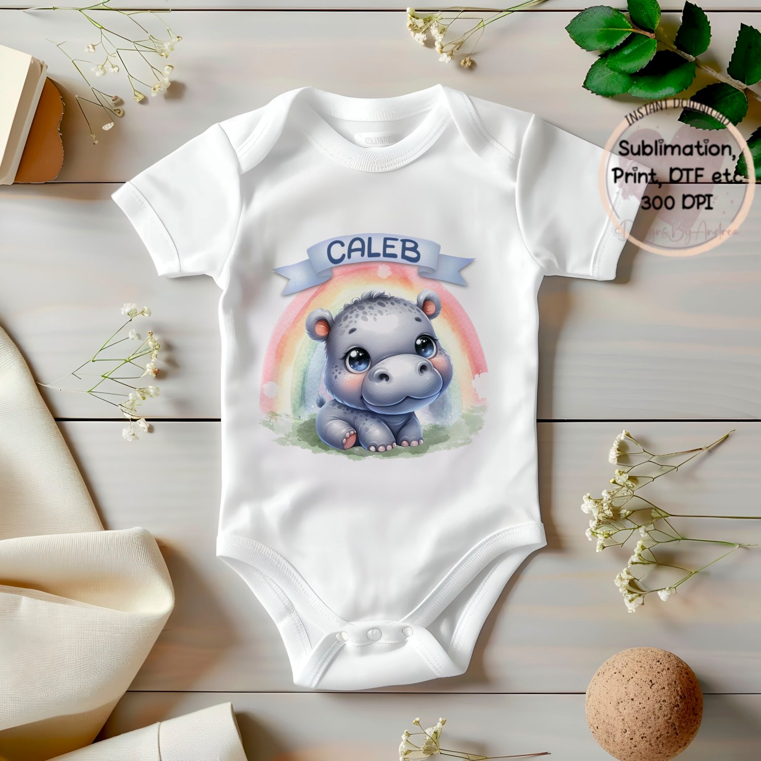Adorable baby hippos and elephants nursery design bundle. 4 PNGs with rainbow and banner detail. Sublimation, print, DTF etc. Prints, clothing, cards etc. No physical products or text supplied.