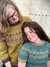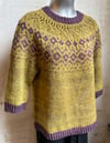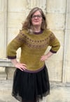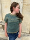 This is a pattern for a jumper worked from the top down and in the round, with a circular yoke and short or elbow length sleeves, and using the stranded colourwork technique.