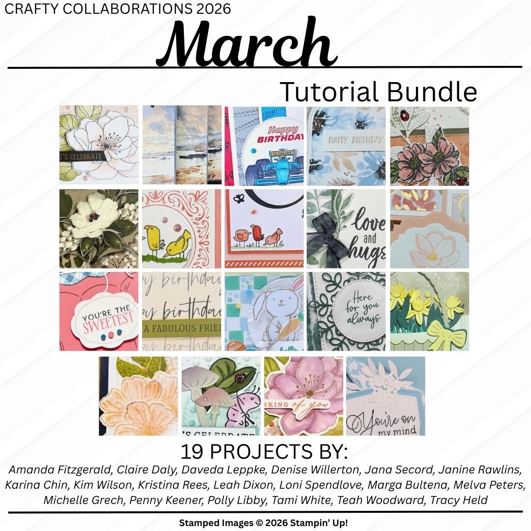 This is an 19 project PDF Tutorial Bundle using current ( as of March 2026) Stampin' Up! Product. The designs were created by a wide variety of Stampin' Up! Demonstrators who are part of the Crafty Collaborations group.