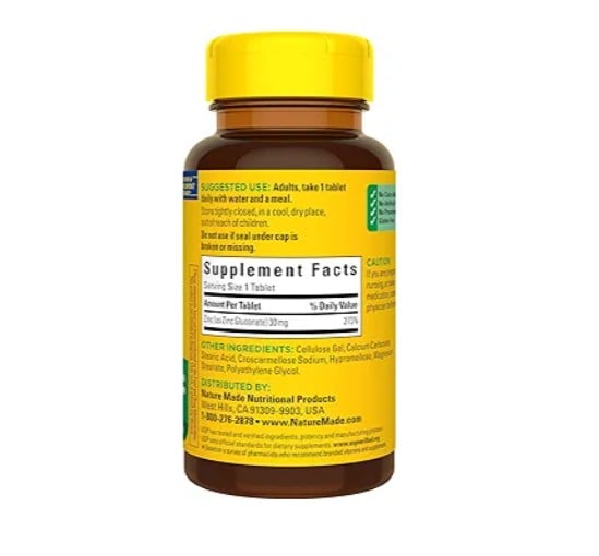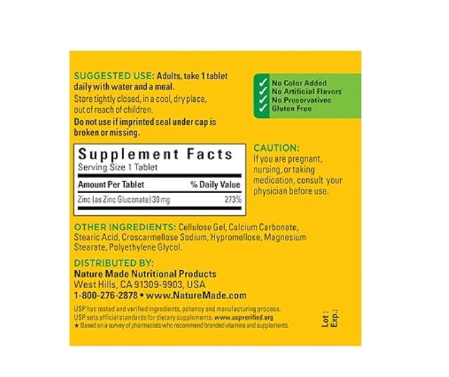Nature Made Zinc 30 mg Tablets are a dietary supplement that supports the body's natural immune defense system. Sourced from high-quality ingredients, this gluten free Nature Made Zinc supplement contains no color added, no artificial flavors and no preservatives. Zinc is an essential nutrient and antioxidant support that plays a role in numerous reactions in the body. This Nature Made Zinc 30 mg supplement supports a healthy immune system and helps support healthy skin. These dietary supplements are great for those looking to increase their daily zink intake. Adults take one of these 30 mg Zinc tablets daily with water and a meal. Start your day with Nature Made zinc supplements. USP has tested and verified ingredients, potency and manufacturing process. USP sets official standards for dietary supplements. Visit the USP verified website for more information. *Based on a survey of pharmacists who recommend branded vitamins and supplements. These statements have not been evaluated by the Food and Drug Administration. This product is not intended to diagnose, treat, cure or prevent any disease.