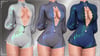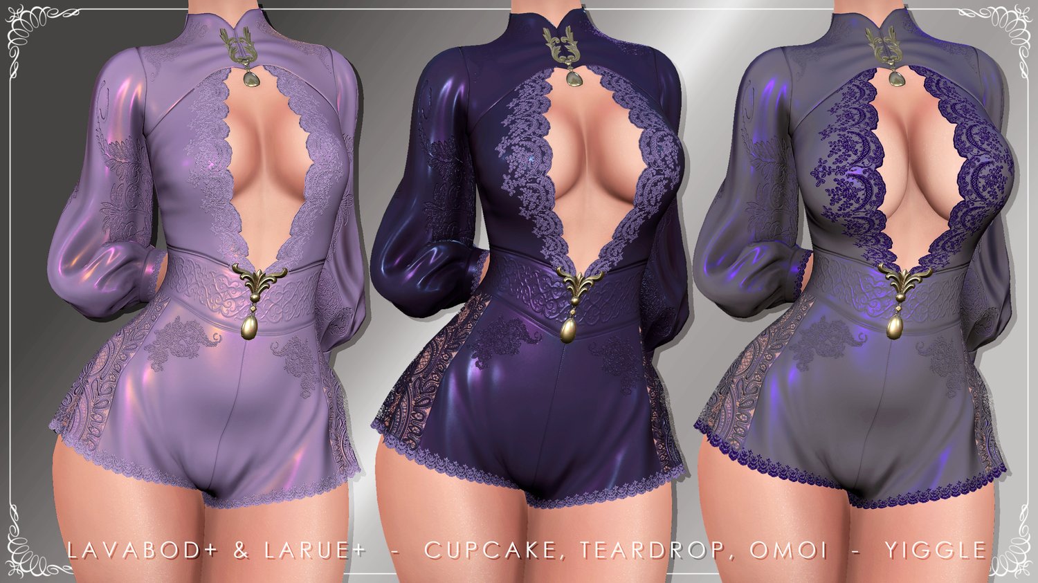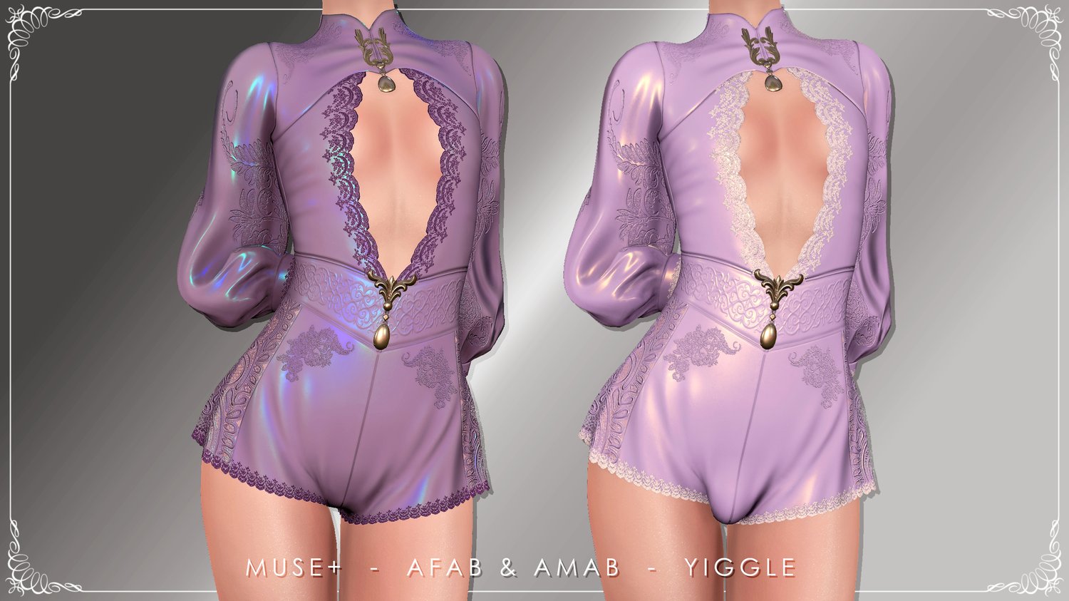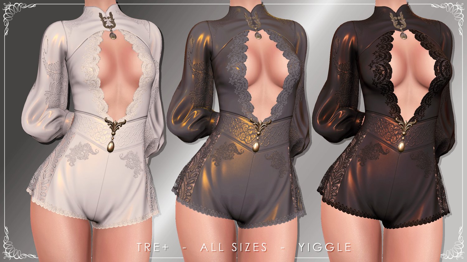 An elegant one-piece outfit with lace elements and floral embellishments.