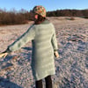 This coat is worked top-down starting with casting on Alafosslopi yarn. It starts at the collar with raglan increases to shape the top. Then sleeves are separated and the body is worked, including hip shaping and pocket holes, and finished by a tubular bind off. Collar, sleeves, pockets and pocket lining as well as button/zipper bands are added by picking up stitches.