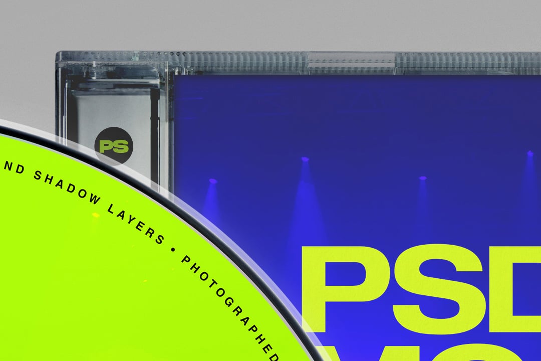 High-resolution CD mockup set with three jewel case angles and one disc (7000 × 5000 px) in layered PSD for professional presentations.