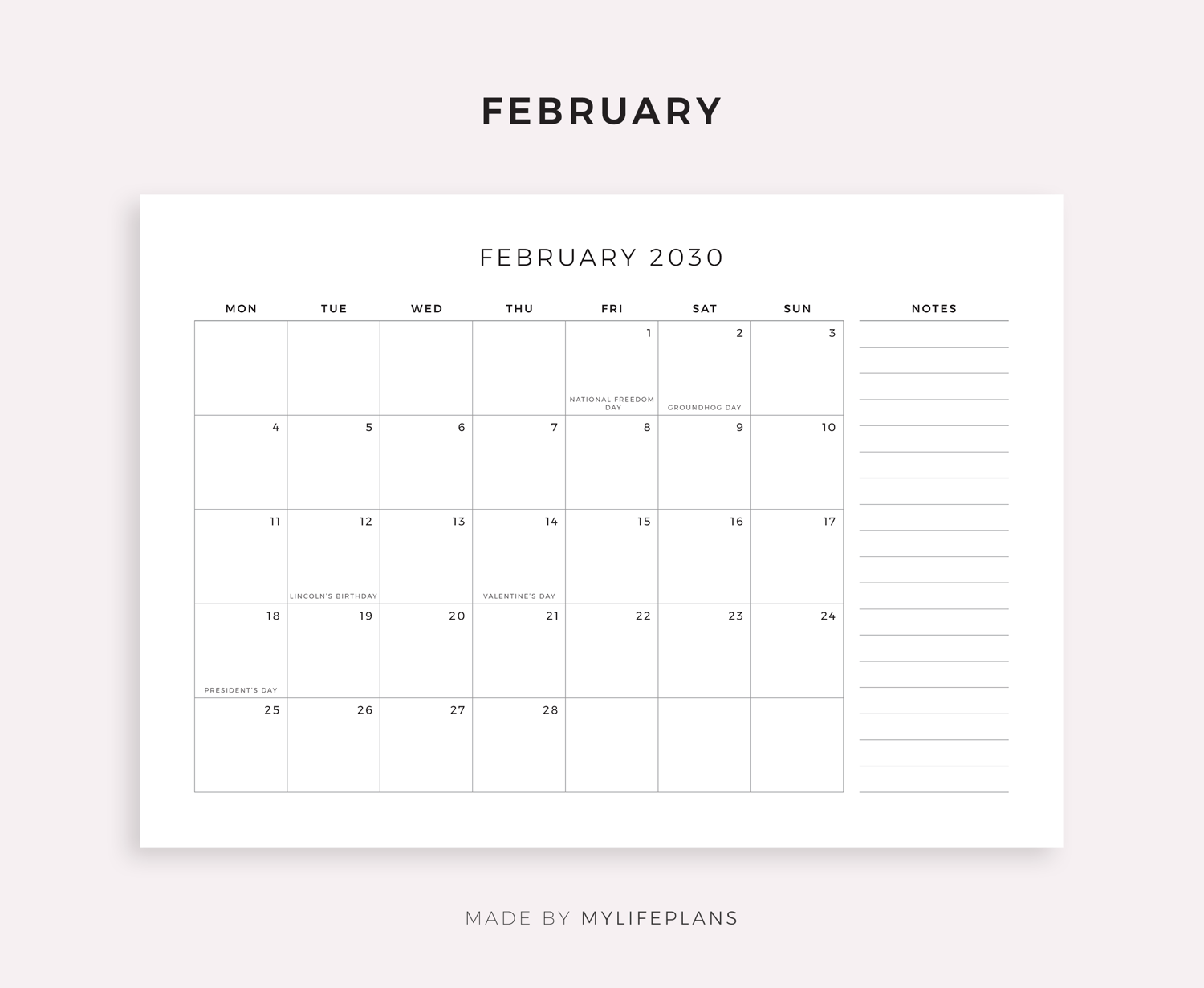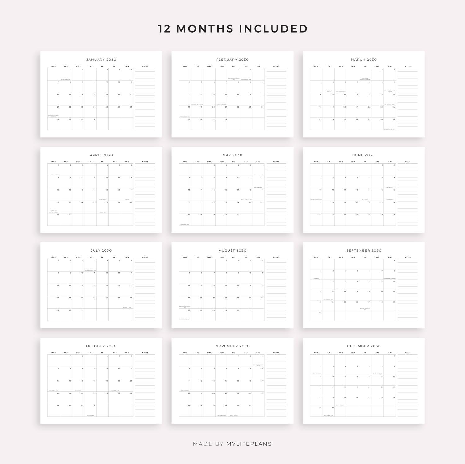This is a printable 2030 monthly calendar with holidays and notes — just download, print, and start using it right away.