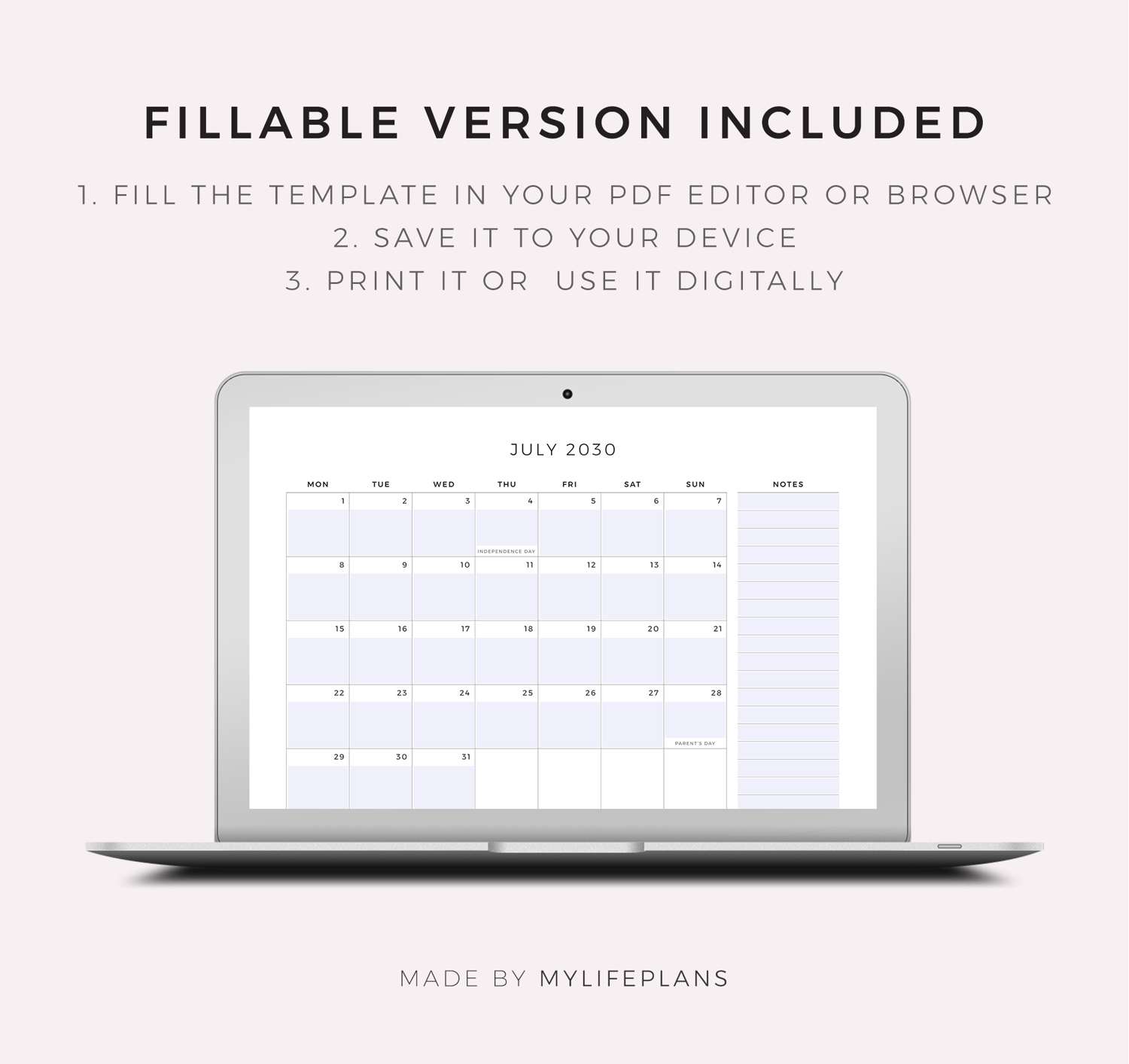 2030 Monthly Calendar with Holidays & Notes, Landscape, Printable & Fillable, A4/Letter Size
