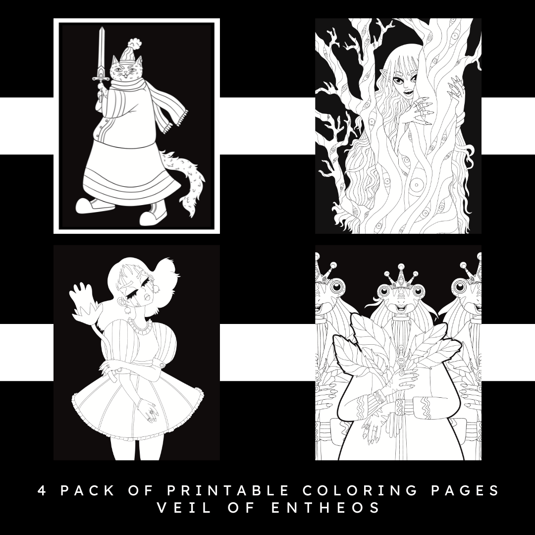 Looking for some awesome original art to color? Check out these 8.5in x 11in printable coloring pages from Veil of Entheos! Each page features unique fantasy characters, animals, and more—all packed with creative details and ready for your artistic flair.