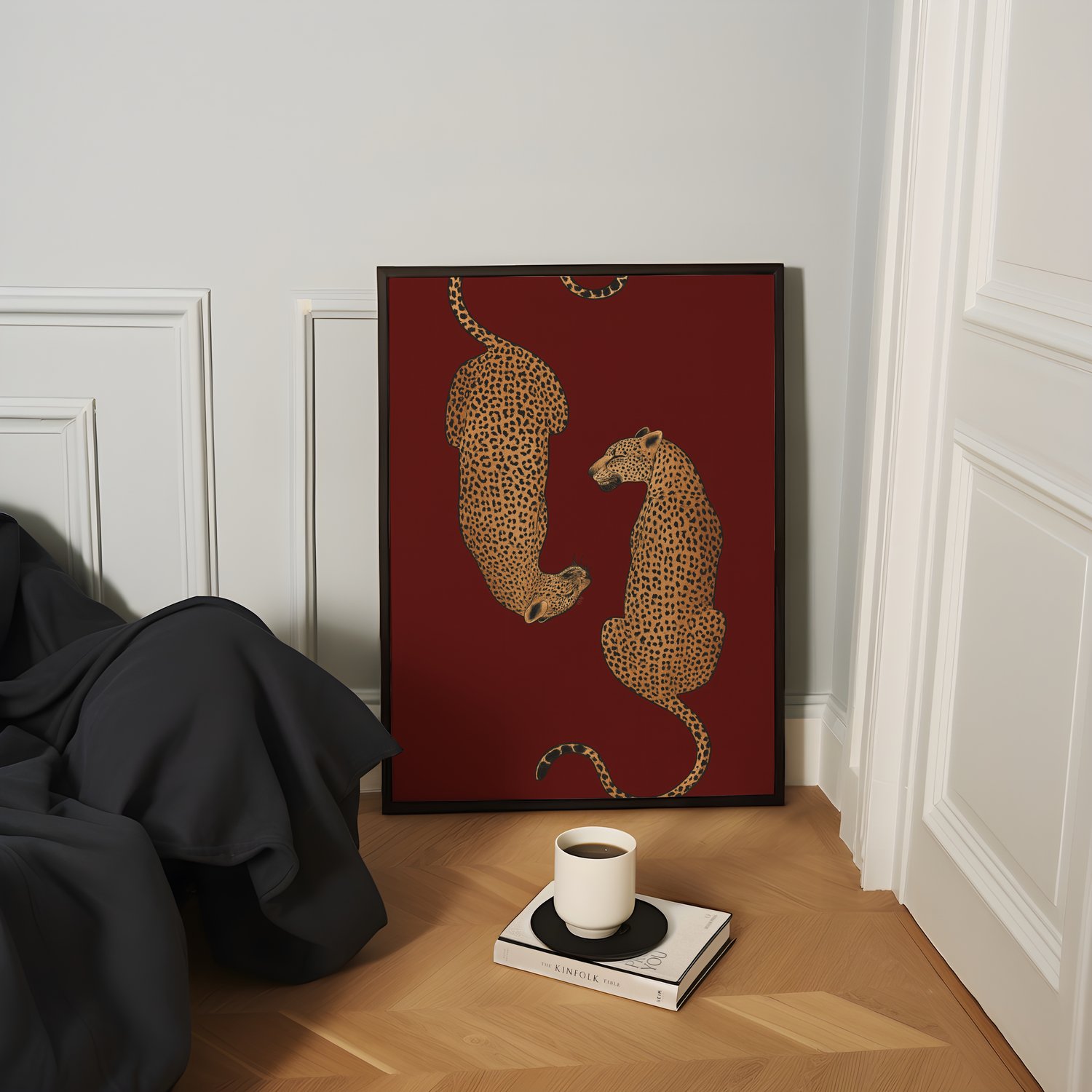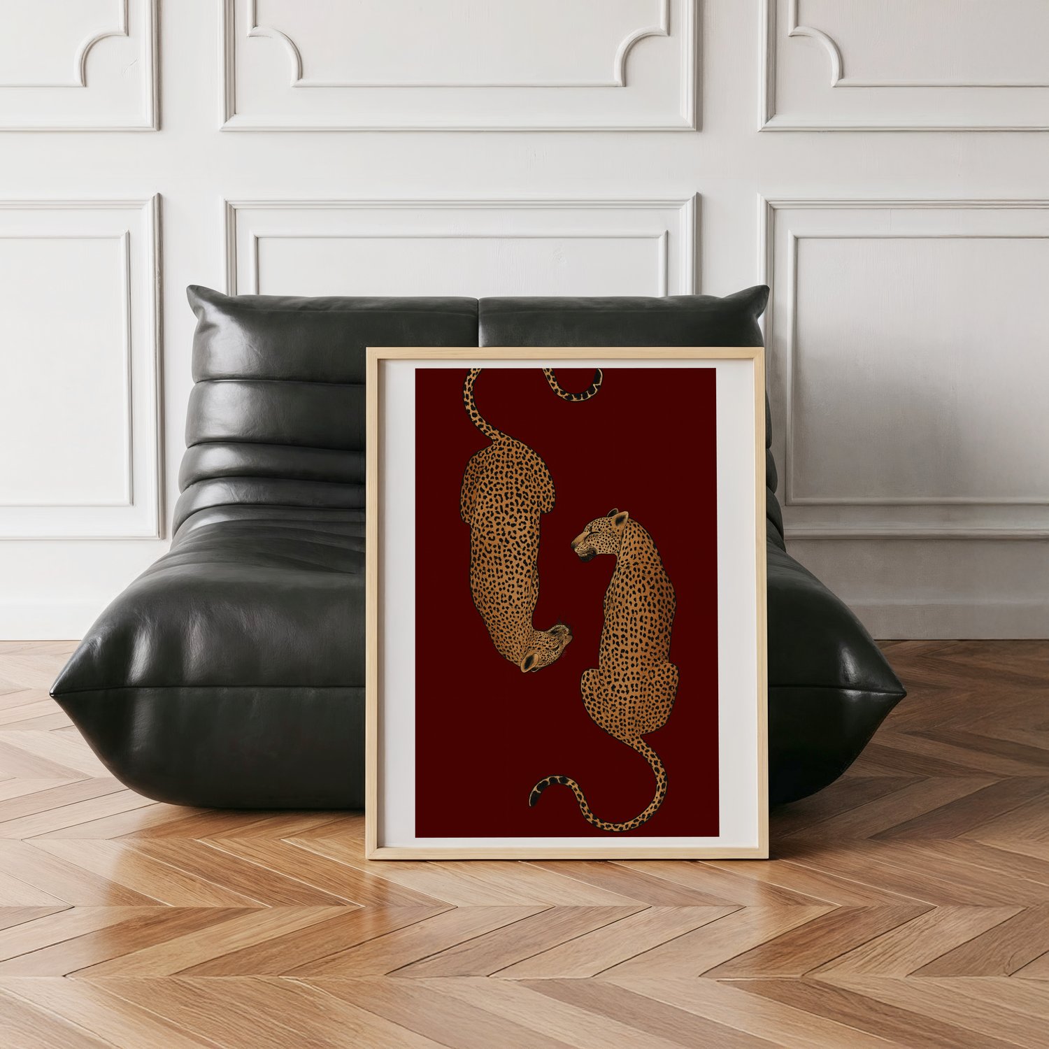 Make a bold statement with this striking leopard wall art print, featuring mirrored leopards set against a rich deep red background. Designed to bring powerful energy and fashion-forward attitude into your space, this artwork blends luxury animal aesthetics with modern editorial styling - perfect for creating a high-impact interior moment.