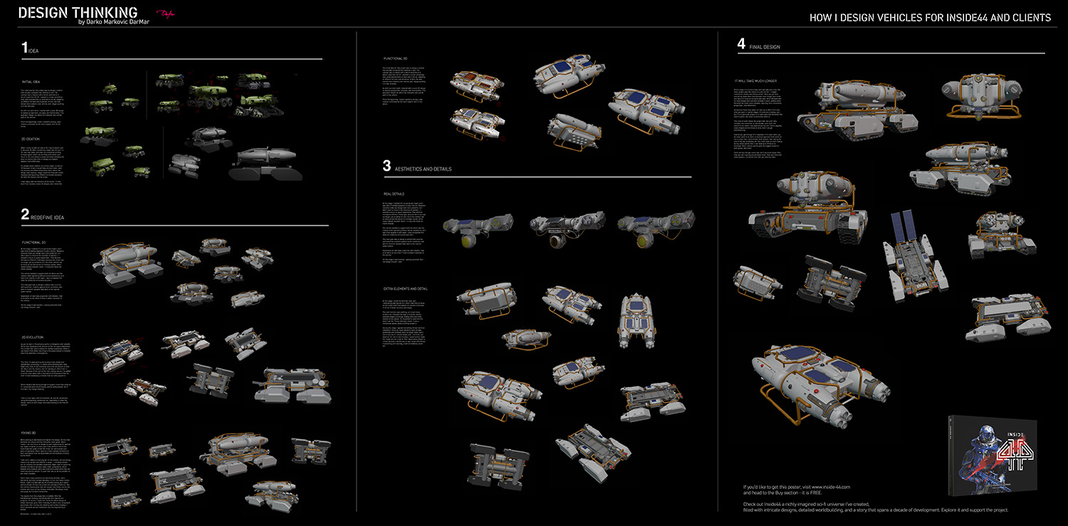 I wanted to share my process for designing vehicles - the same approach I use for client projects and for Inside44, a universe I’ve created filled with intricate stories, futuristic technology, and unique worlds. Inside44 is a labor of love spanning a decade of design - 544 pages, storytelling, and worldbuilding - please take a look!