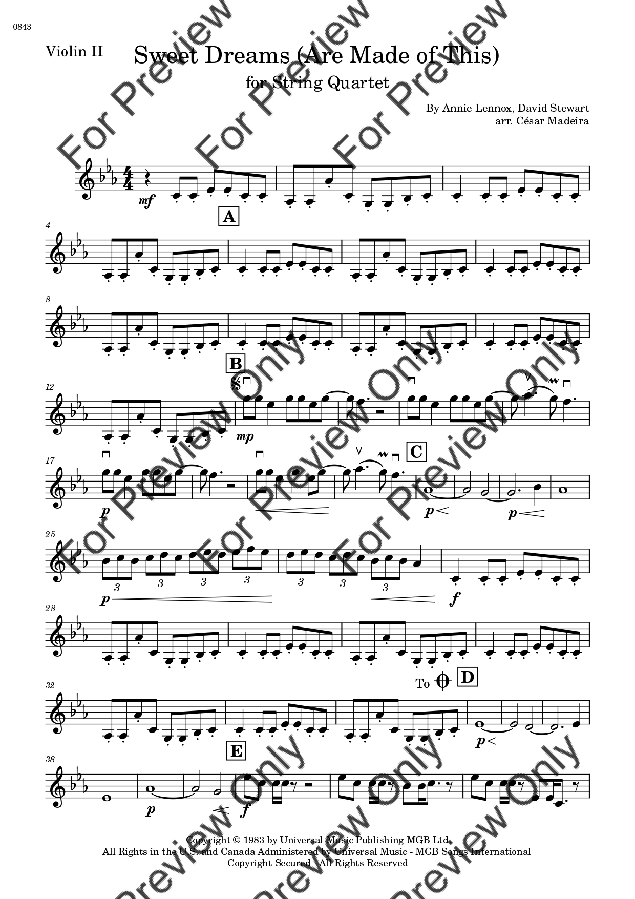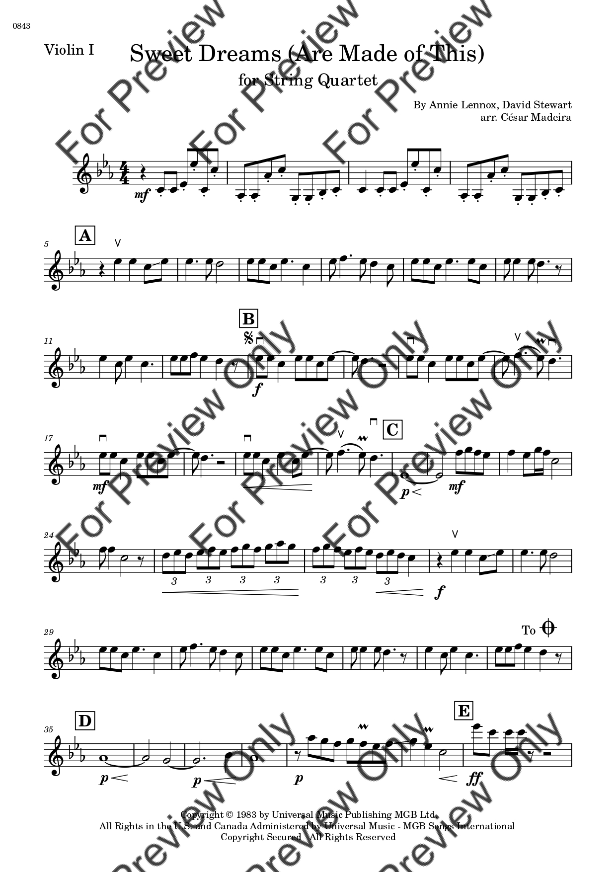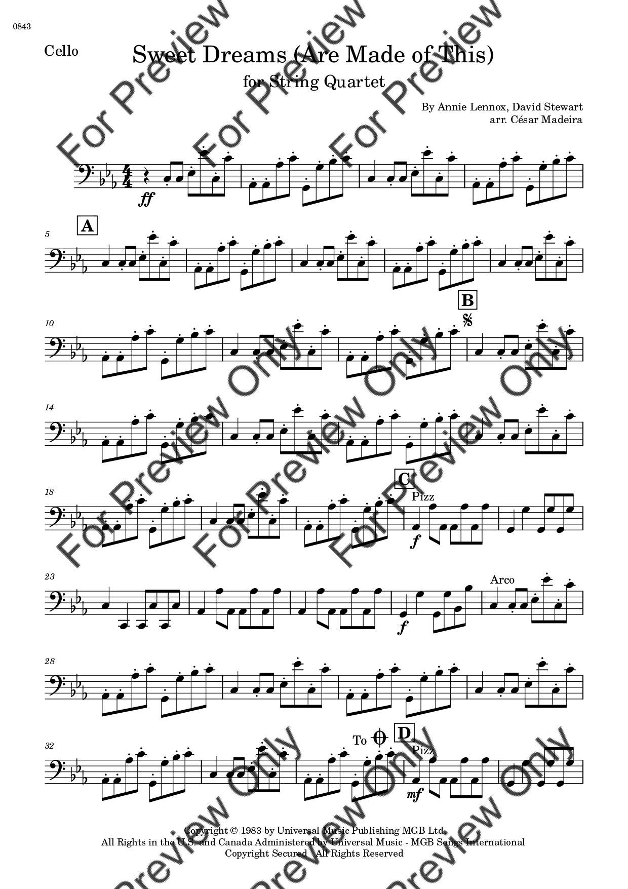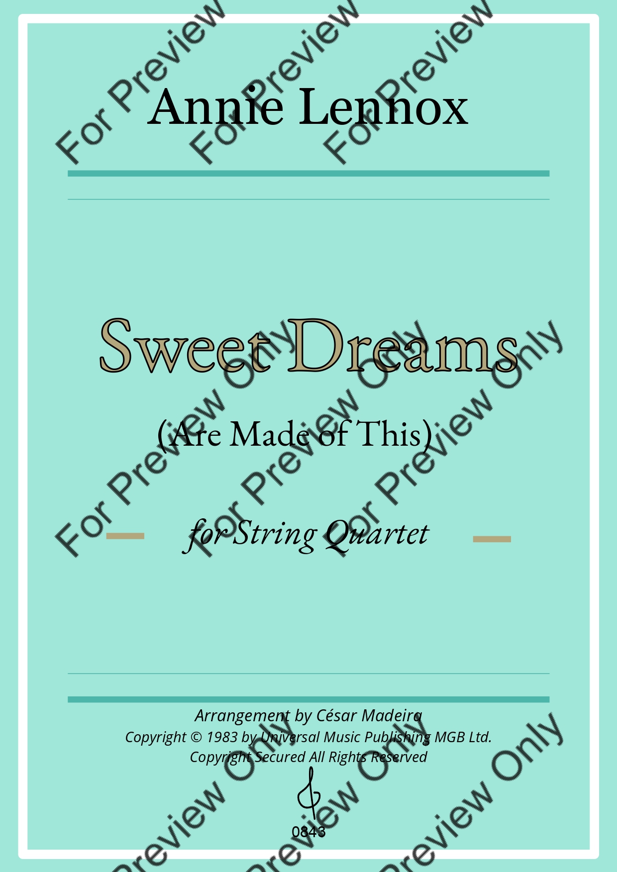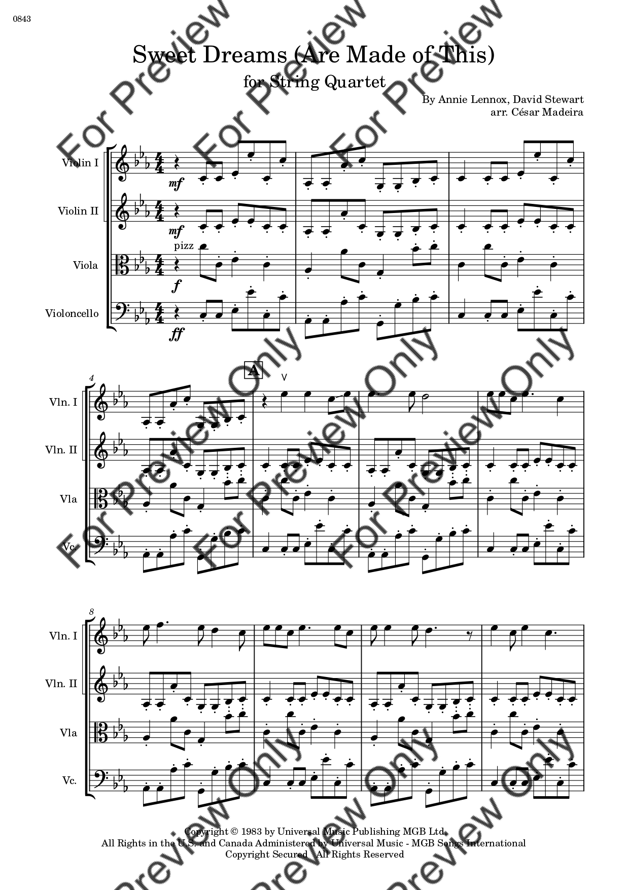 Sweet Dreams (Are Made Of This) by Eurythmics. Arrangement for String Quartet - Violin 1, 2, Viola and Violoncello. With Full Score and Individual Parts. Have fun!
