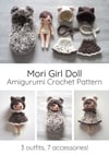 The Mori Girl Doll pattern features a sweet amigurumi with three different outfits and a total of seven accessories to dress her up in. That includes a kitty cat ear hood, teddy bear ear bonnet hat, scarves, dresses, and a sleep sack (or sleeping bag). This amigurumi design is relatively quick to work up and can easily be customized with different yarn color combinations and added embellishments or appliques. Children will love playing dress up with the clothes and extra items in this bundle! Crochet this great play toy set for kids birthday or holiday gifts!