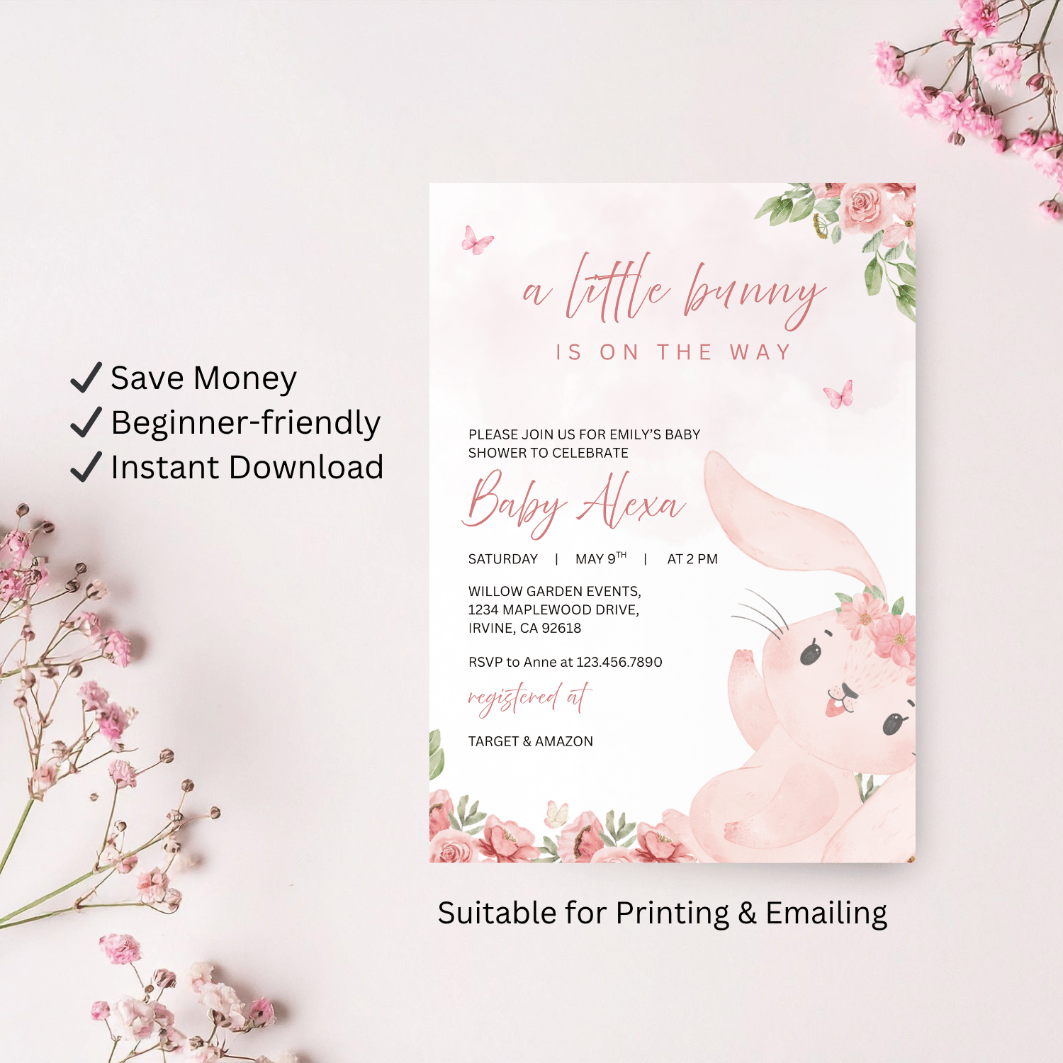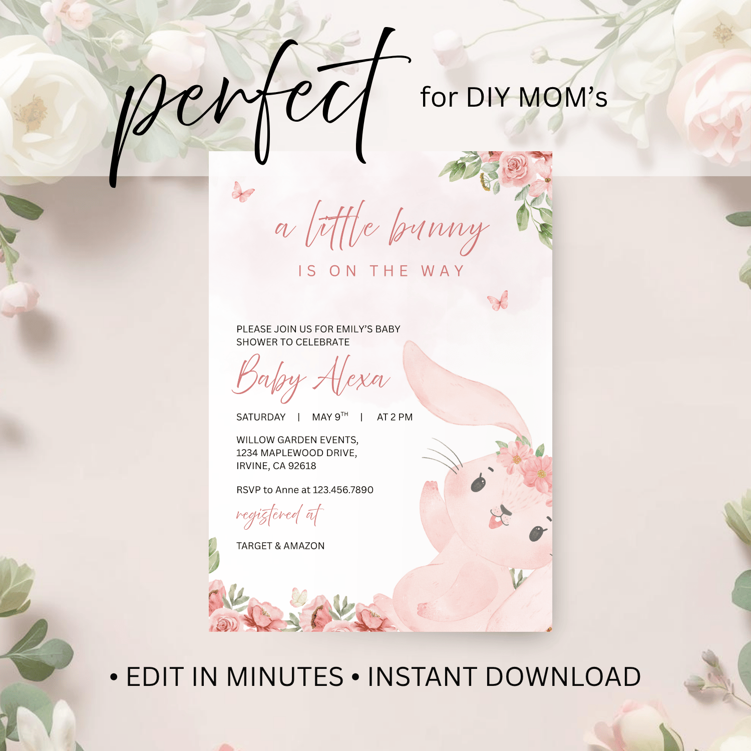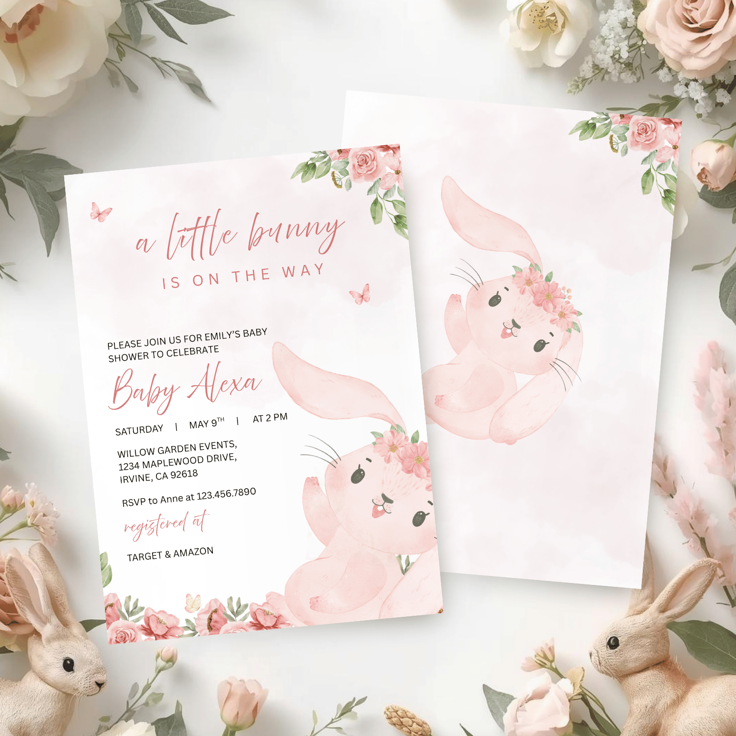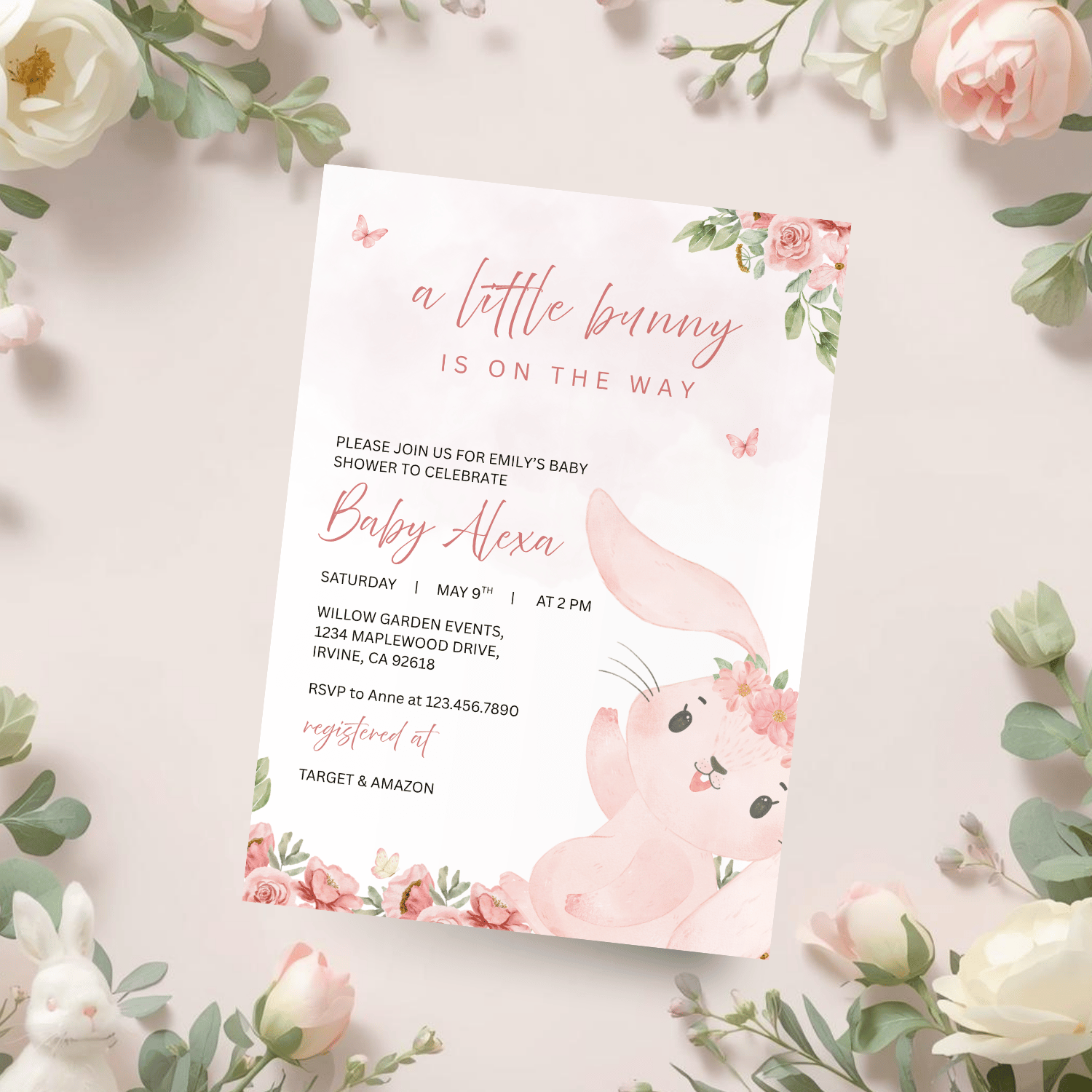 Featuring a soft pastel pink background at the top with delicate butterflies, along with pink roses and green leaves at the top right and bottom left corners, this invitation creates a gentle, garden-inspired feel. A cute bunny with floral accents on its head adds the perfect touch of sweetness and charm.