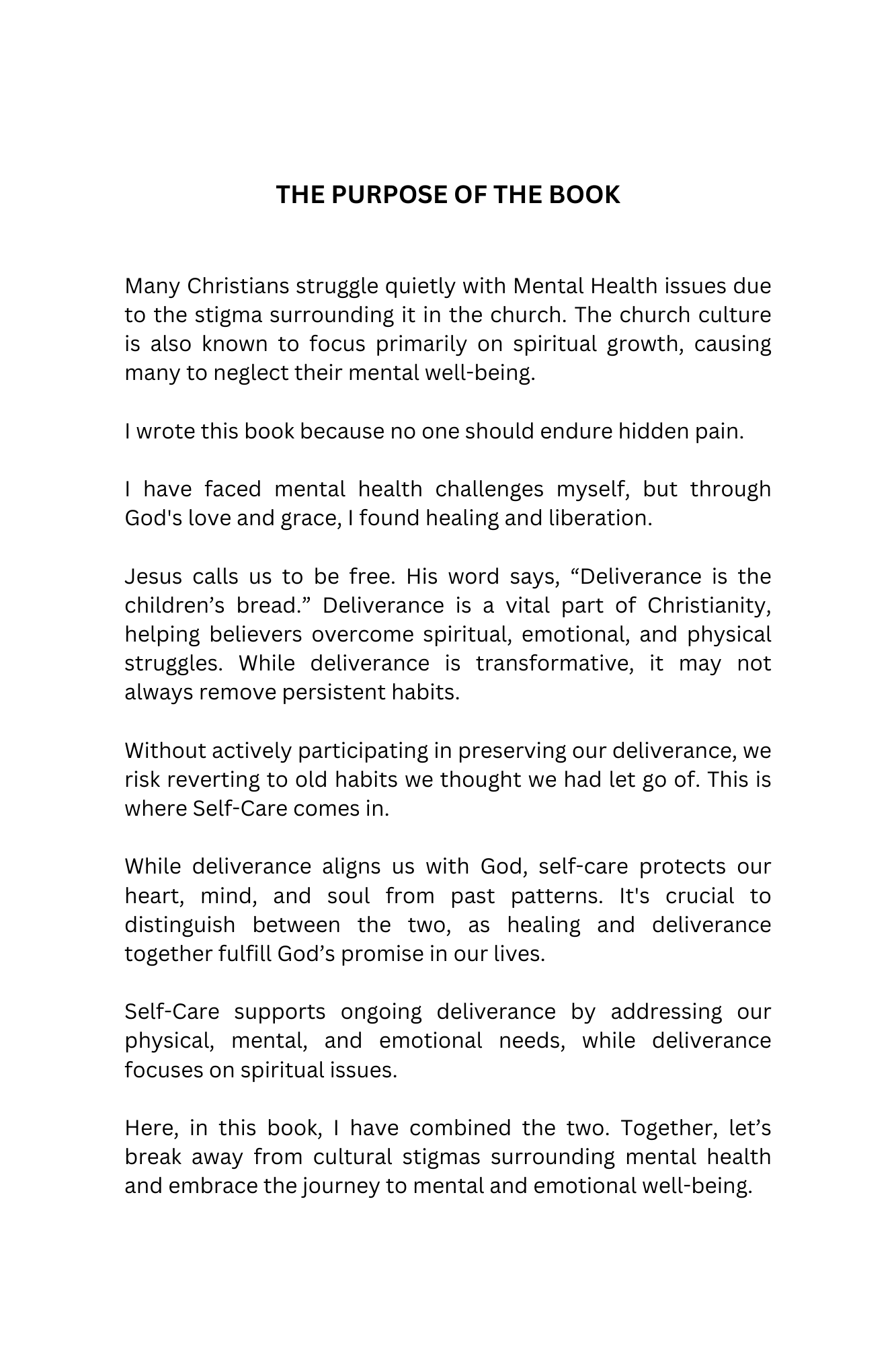 Many Christians struggle quietly with mental and emotional issues in secret due to the stigma surrounding it in the church. The church culture is known to focus primarily on spiritual growth, causing many to not discuss and/or neglect their mental and emotional well-being. I wrote this book because no one should endure hidden pain alone.