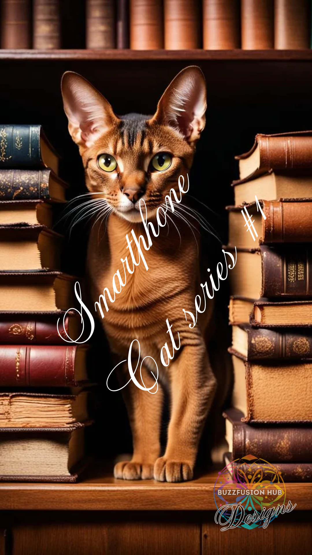 Description: Transform your phone with this captivating wallpaper featuring a professional photograph of an Abyssinian cat. The cat, with its sleek, short coat, peeks out from behind a stack of vintage books on a wooden bookshelf. The hyper-detailed, wide-angle lens capture and cinematic lighting highlight the cat's inquisitive nature and the nostalgic charm of the vintage books.