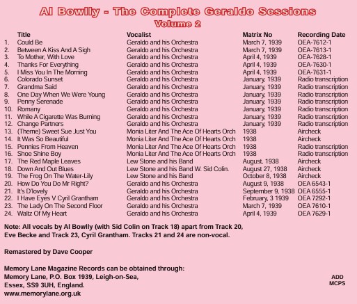 Here is the second volume of wonderful recordings Al Bowlly made with the Geraldo orchestra in 1938 and 1939. Some really great performances to enjoy including rare broadcast material.