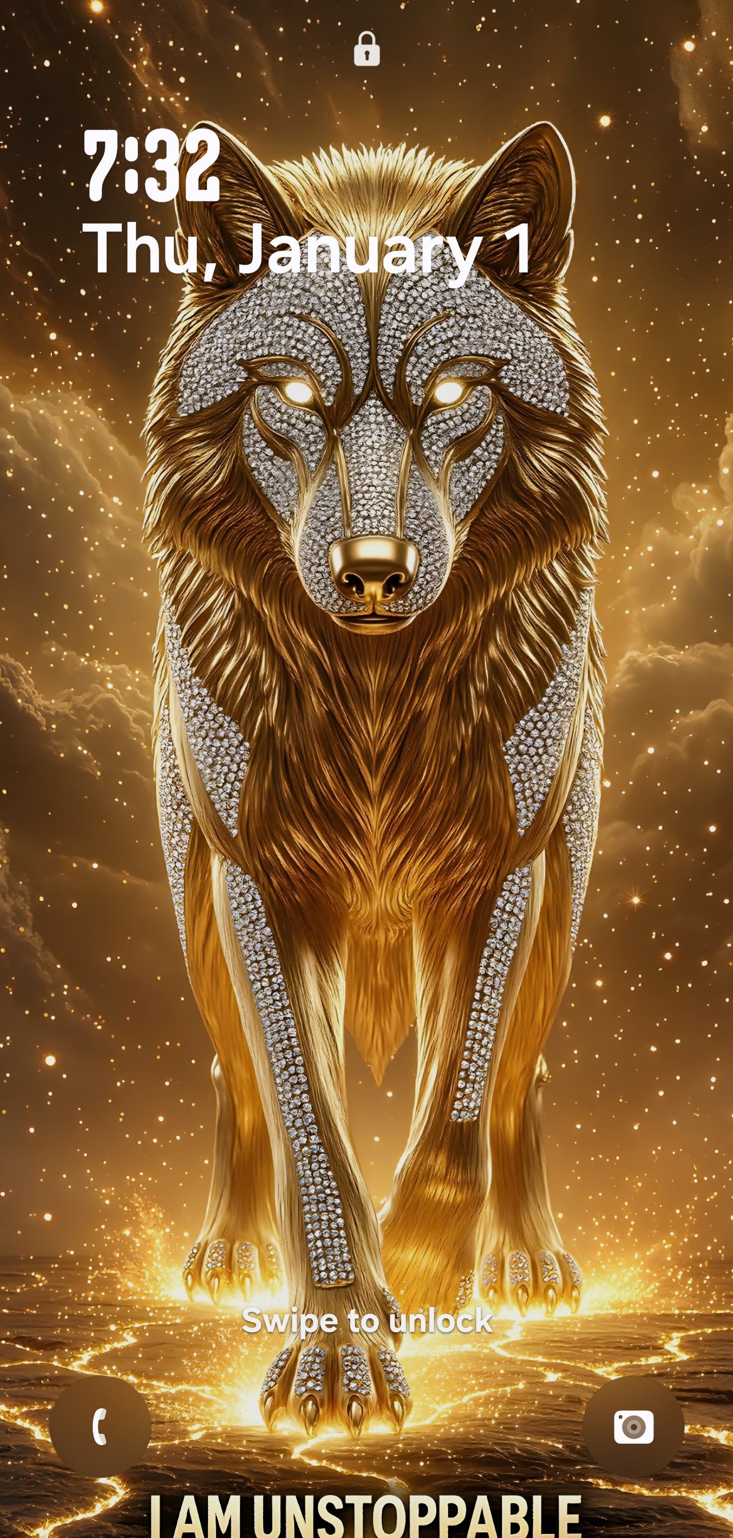 Unleash unstoppable energy with I Am Unstoppable, a bold and empowering 8K phone wallpaper showcasing a radiant golden wolf forged with diamond-like brilliance. Standing on glowing cracked ground beneath a celestial sky, this piece symbolizes resilience, leadership, and fearless forward motion.