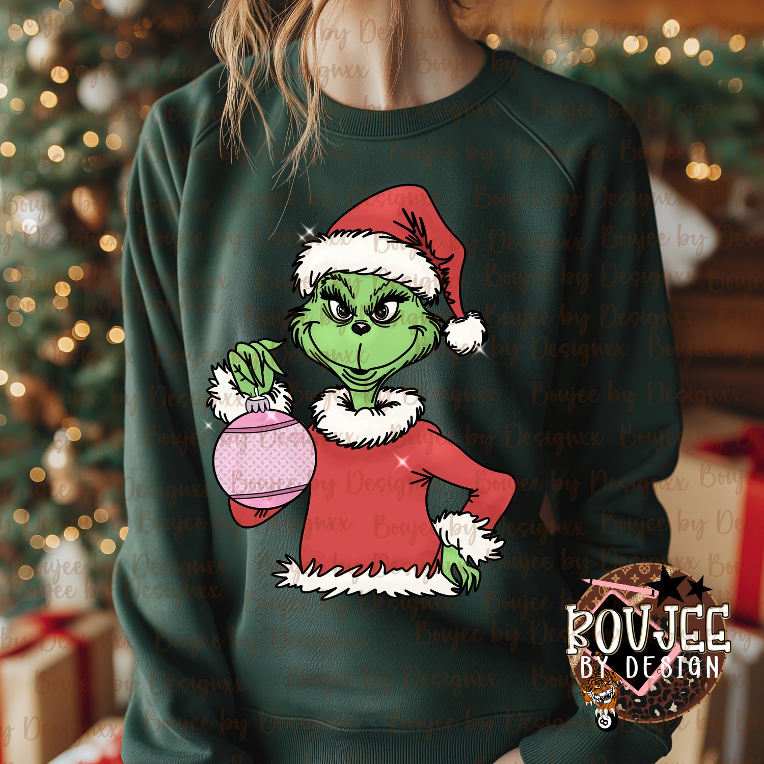 Sassy Grinch Holding Ornament – Christmas PNG | Festive Holiday Design | 300 DPI Sublimation / DTF