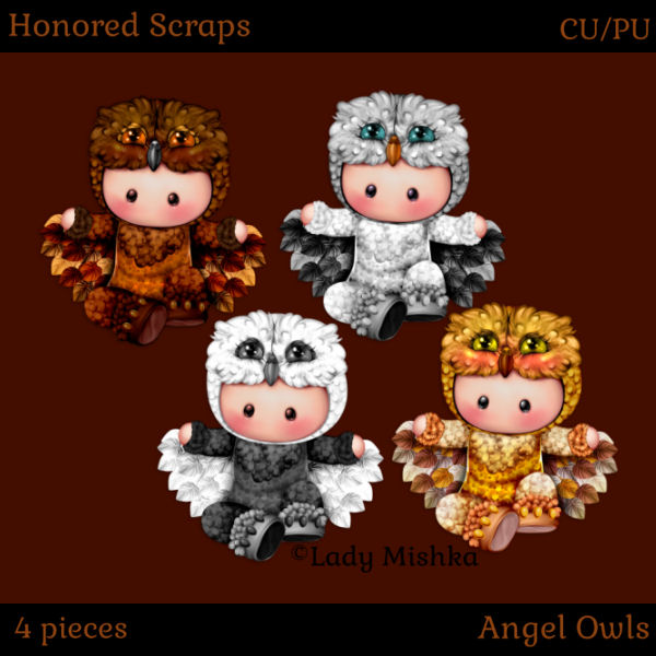 These can be used as a tubes, CU elements (for those designers out there). The pack comes with 4 owls.